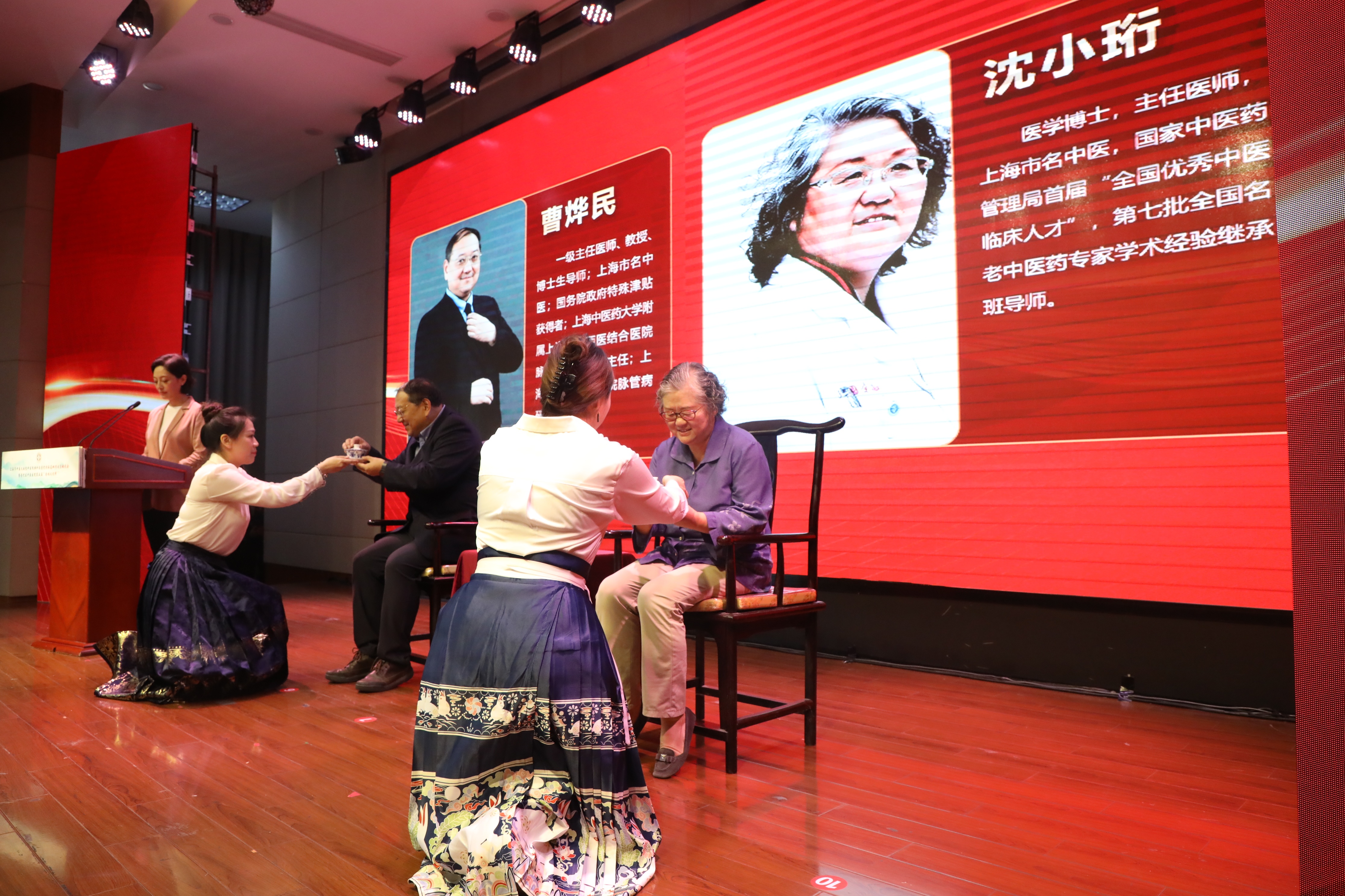 现场还举行了普陀区中医医院“杏林文化节”传统项目——拜师结对仪式。千百年来,中医学多以“师带徒”“言传身教”的方式传承和发展。“拜师结对”是普陀区中医医院人才培养的重要途径,从1996年沿袭至今,在各位名医名家的精心培养下,已有34位中医传承人出师,累计获得项目课题50余项、发表论文150余篇。