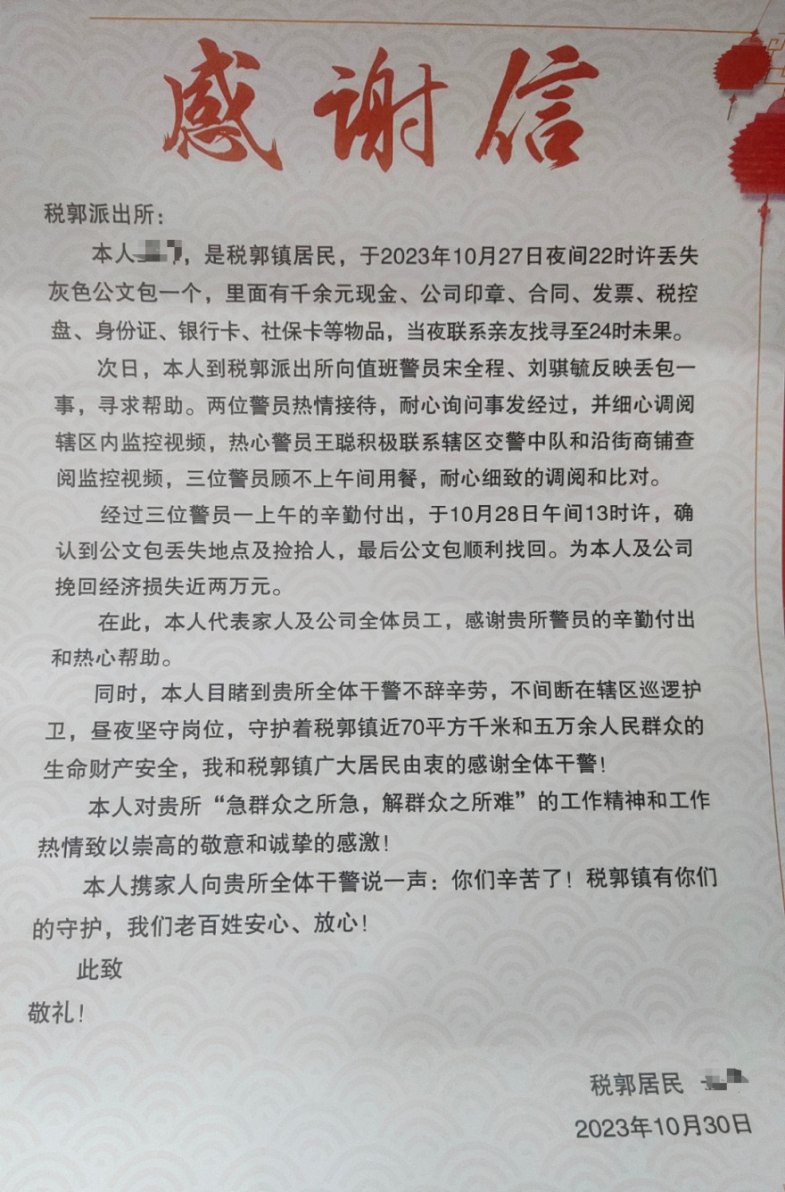 10月27日,市中区税郭镇居民王先生不慎将公文包丢失,内有公司重要文件、合同,市中分局税郭派出所接到报警后6小时将包找回。