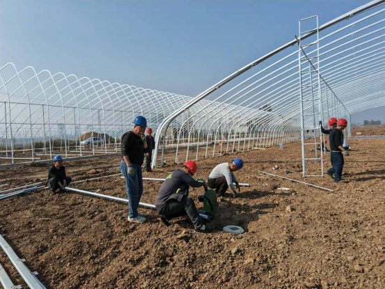 在“万亩千棚”建设现场,伴随着挖掘机的轰鸣声,安装施工队正在紧张的焊接、固定、安装大棚钢架,一派热火朝天的施工场面。在工人的操作下,一根根钢架凭地而起,伫立在肥沃的土壤上。