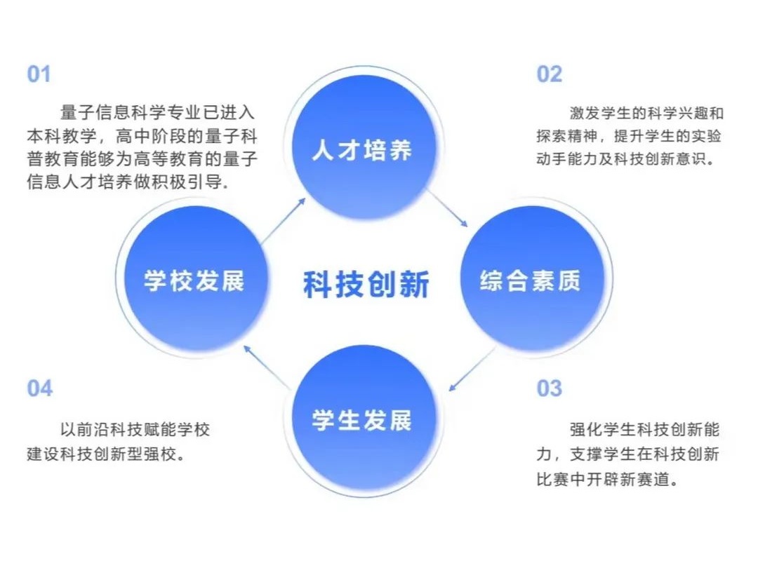 热爱的力量是巨大的,而持久的热爱必将推动一大批创新人才的成长。对基础教育来说,前瞻性建设量子信息科技教学创新平台,利于学生在高中阶段了解及接触量子信息技术,激发学生的科学兴趣和探索精神,引导学生关注前沿科技,为培养量子信息人才厚植基础,为学校创新发展注入新动能。