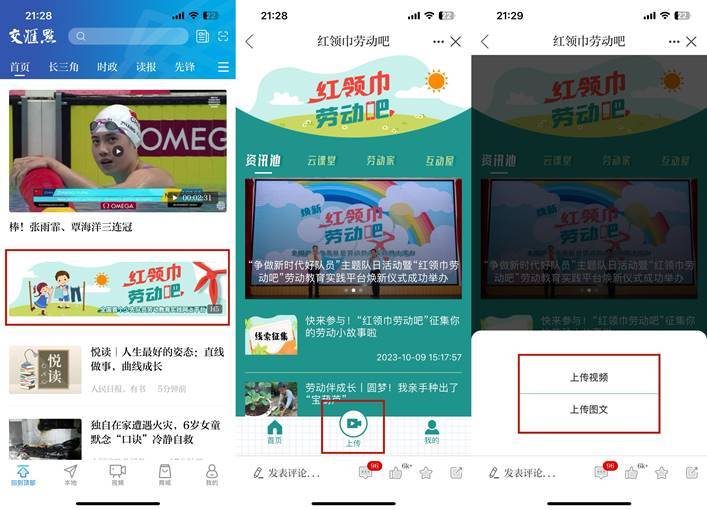 2.登录交汇点客户端“红领巾劳动吧”上传