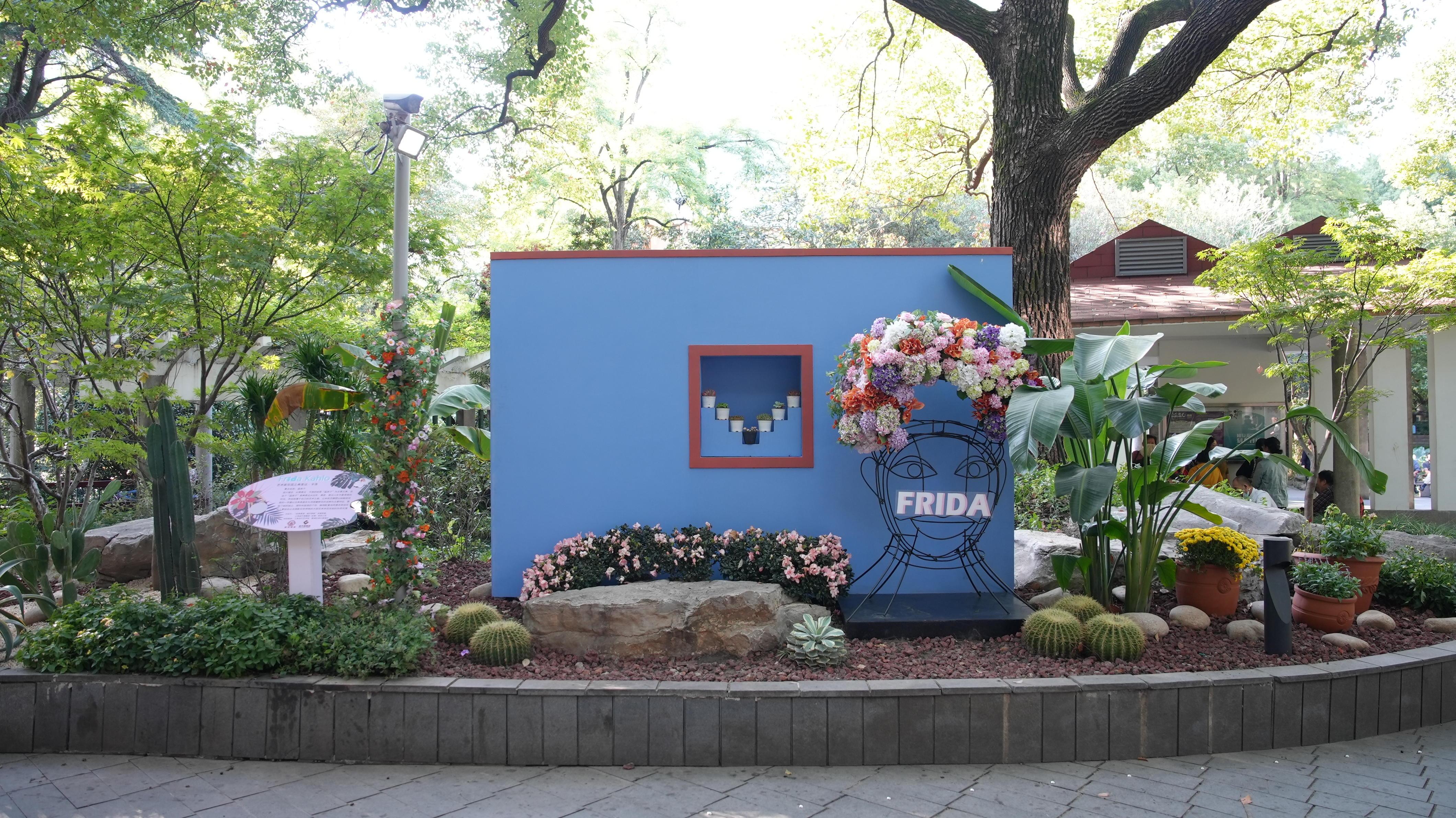 在艺术馆墙外的人民公园自然空间里,金外滩集团重塑了一个别致的“蓝屋”,和墨西哥传奇女艺术家弗里达·卡洛(Frida Kahlo)的“蓝房子”遥相呼应。在这个“蓝房子”里,弗里达·卡洛出生、离世,度过了人生中最艰难的时光,并找到了属于自己的艺术之路。现场,立体铁艺雕塑,以她额前浓密的一字眉以及高高盘在头顶插着鲜花的发辫为主要特征,展现了她的独立、理性和倔强的个性。植物配置选用了墨西哥国花仙人掌组合以及搭配花色鲜明的大丽花,来体现浓郁的热带风情。路过的市民、游客,看到如此独特又富有艺术气息的布置,纷纷拍照留念。