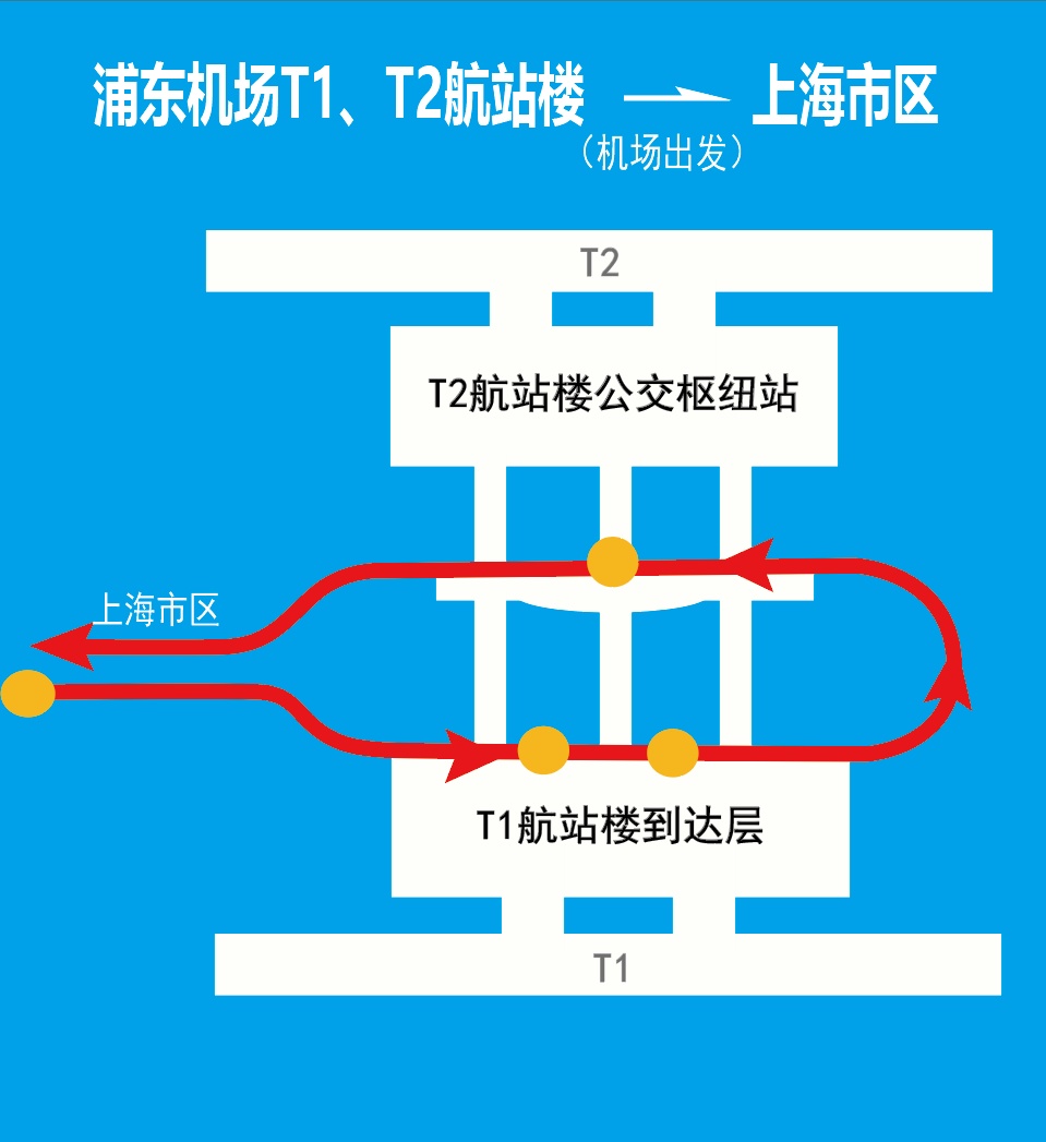 上图:上海市区↔浦东机场T1、T2航站楼走向图