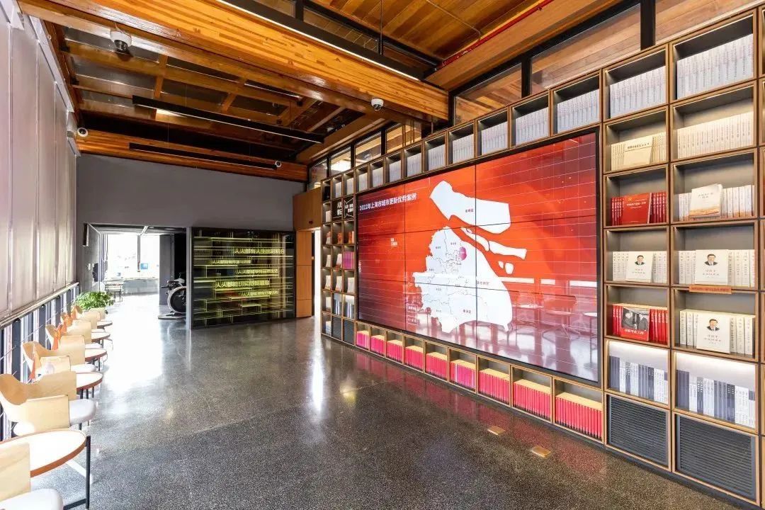 四排可触控、可互动的书架,交替存放着实体书与电子“书”,分别呈现重要理念的理论渊源、发展脉络、丰富内涵和时代价值;在“人民秀带直播间”里,市民现场即可参与党课、人民直播等活动;而“人民城市·杨浦故事”展厅则以长条电子大屏,展示改革开放以来杨浦在建设、治理与发展过程中涌现的先进人物、人民故事;地下展厅内开放展示3个互动影像盒,记录了19世纪至今的杨浦滨江历史沿革……
