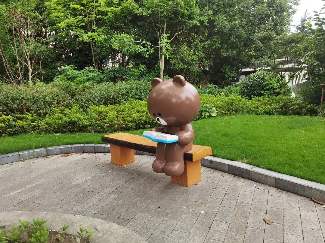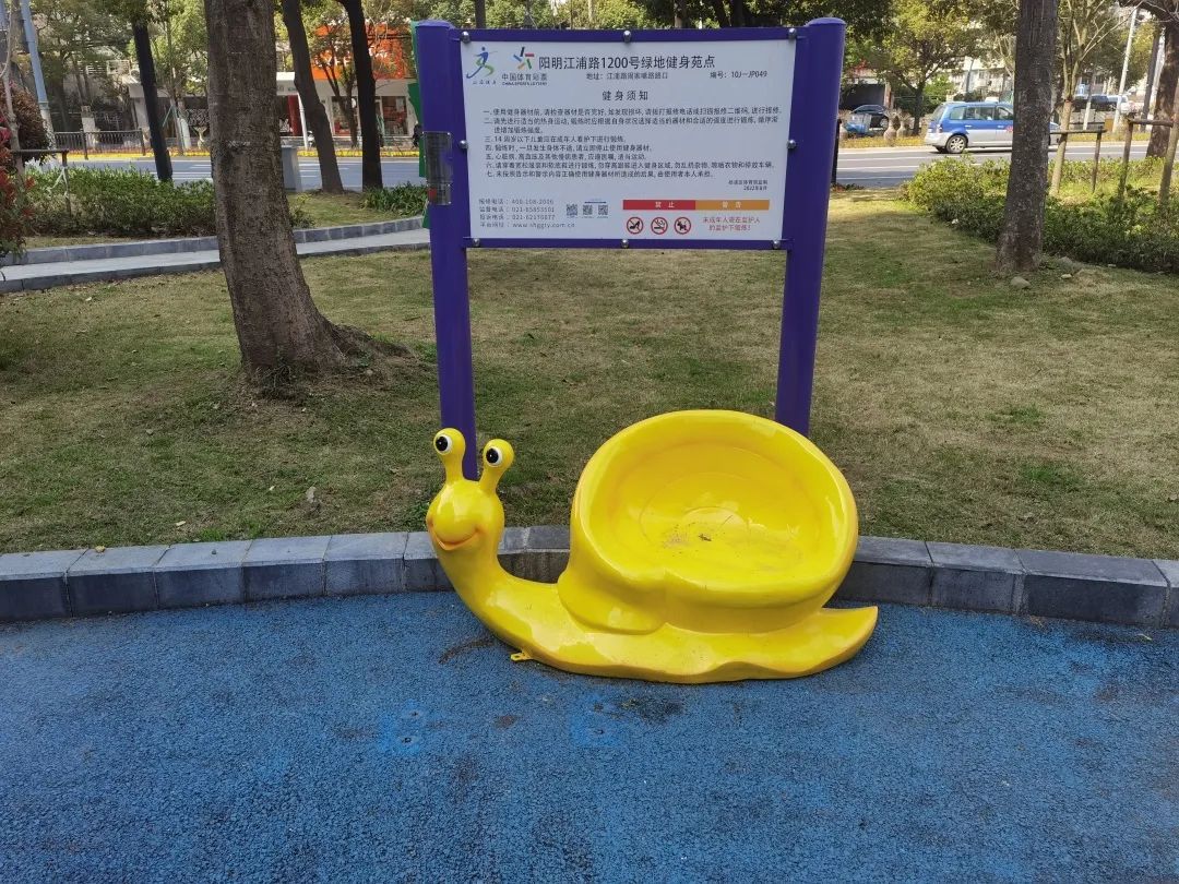 在周家嘴路口星洲城的街角花园内,围绕健身休闲设施设置了座凳。考虑到该处小朋友活动较多,座凳选择鲜亮的色彩和卡通的造型,丰富了视觉,兼顾景观与功能。