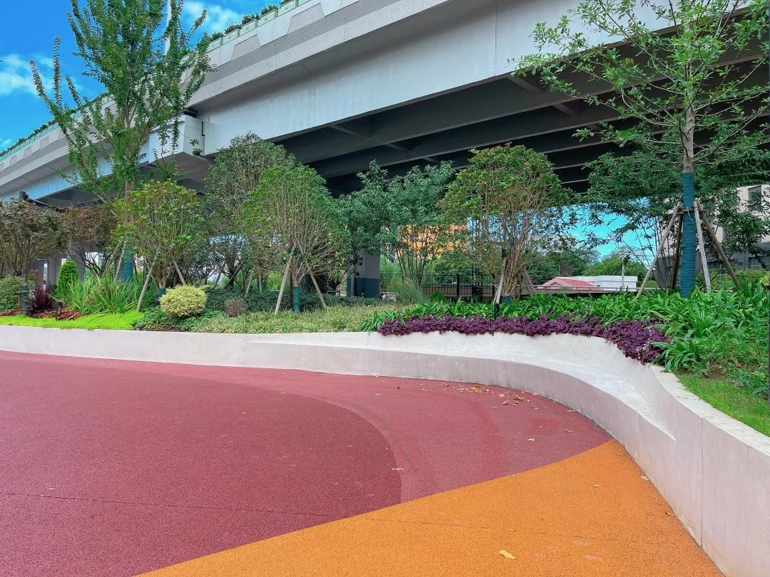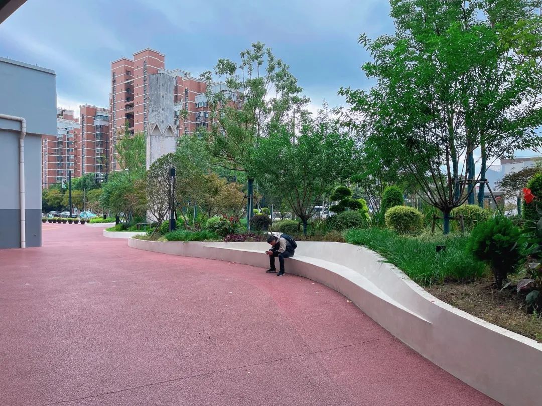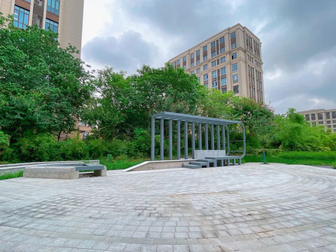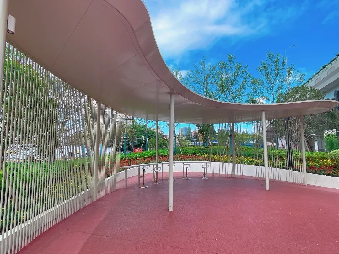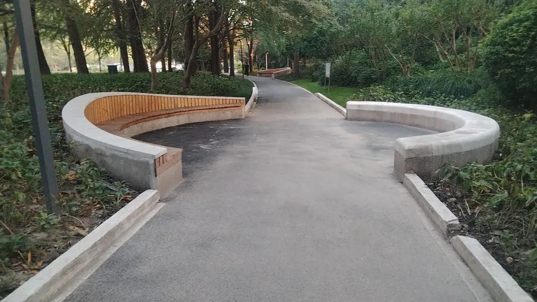 新增半幅弧形靠背增加了整体座椅空间的韵律感,同时结合座椅周围设置主题植物八仙花,营造良好的景观氛围,夜间该区域增加灯光照明,更加凸显座椅的“圆舞曲”主题。