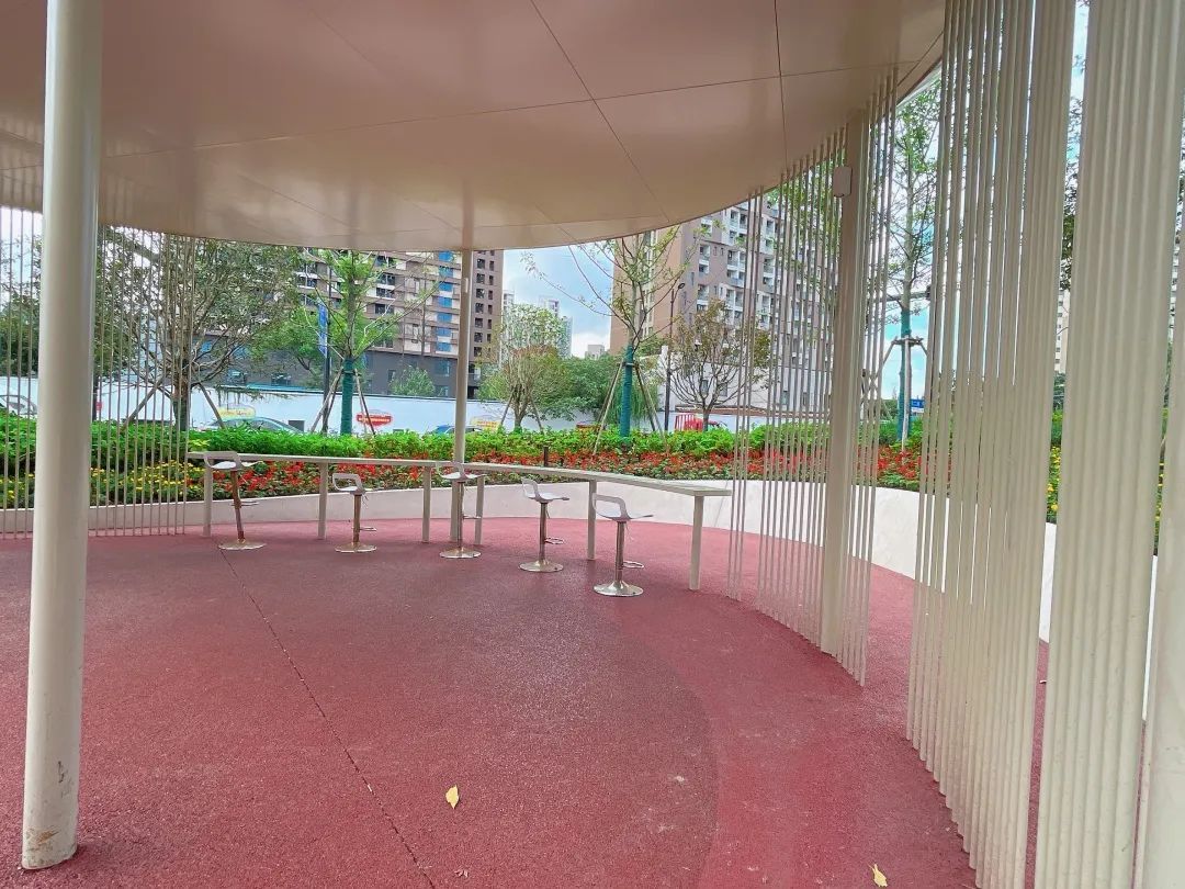 绿地另一侧的休息廊架内设计了流线型的置物台,考虑社交距离及使用需求采用了单个的吧台凳形式座椅,可旋转且高度可调节,方便不同人群使用,体现了街区的温度。