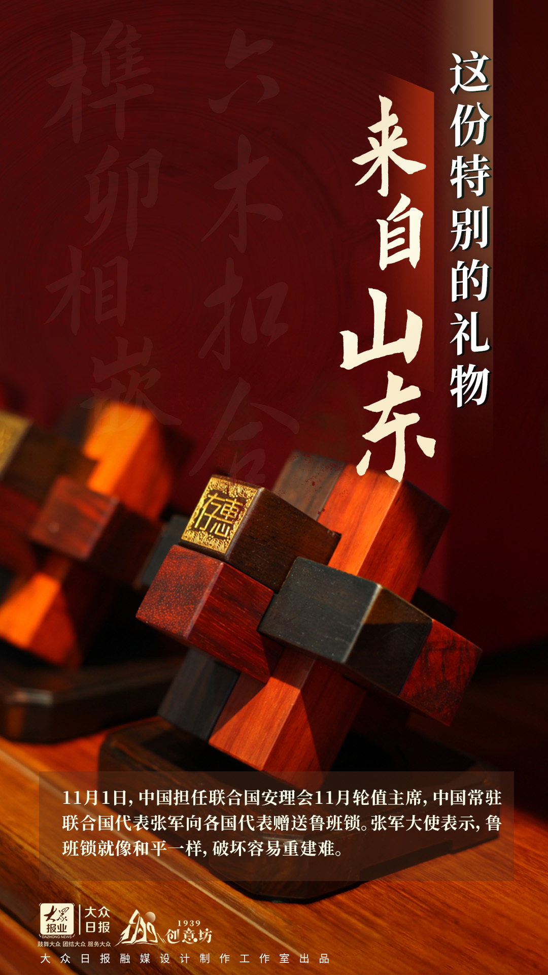 11月1日,中国担任联合国安理会11月轮值主席,中国常驻联合国代表张军向各国代表赠送鲁班锁。张军大使表示,鲁班锁就像和平一样,破坏容易重建难。