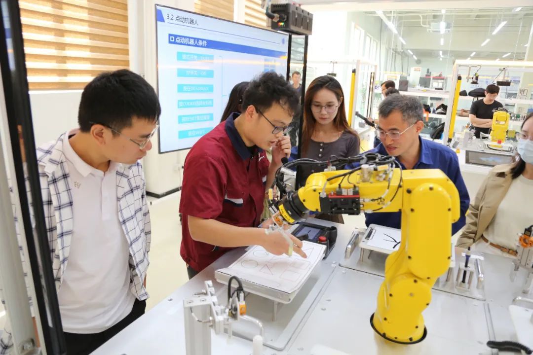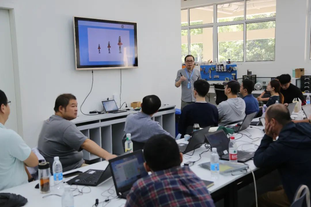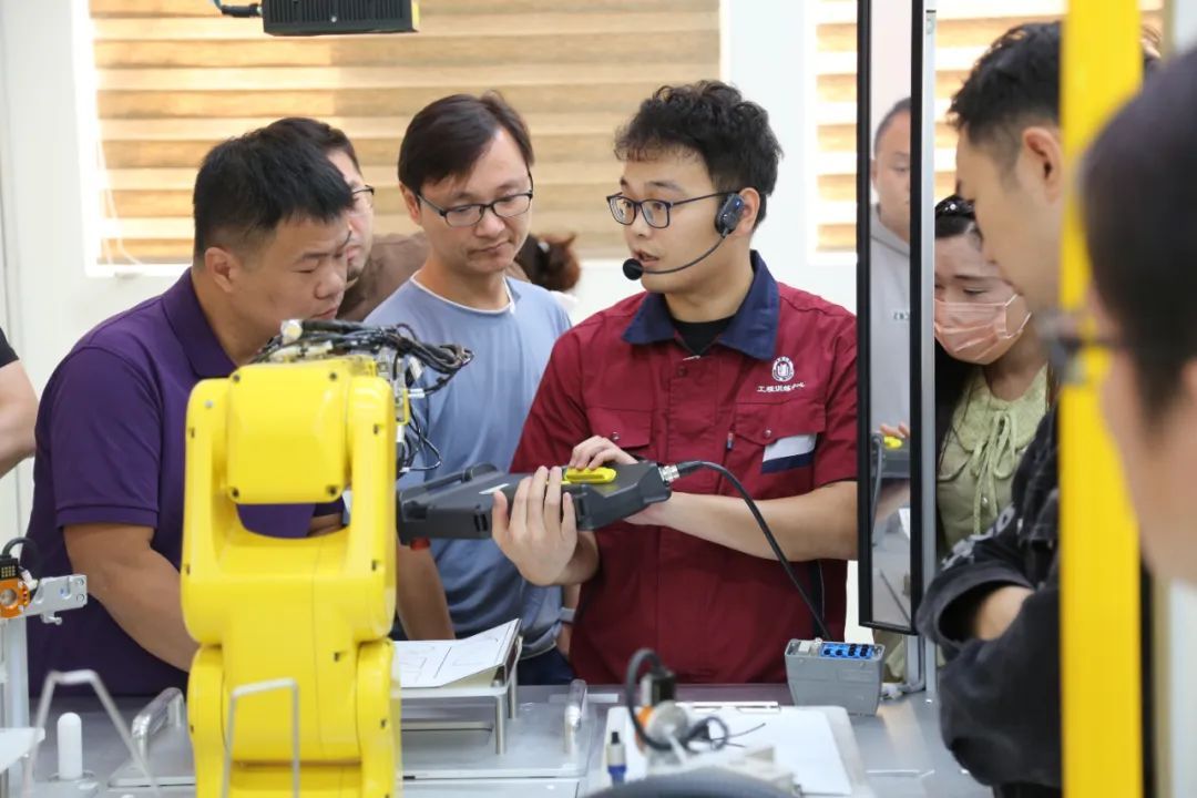 在多工位机器人课程中,专家利用国内领先的多工位实践教学系统为学员们进行轨迹模拟示范。在认真观摩后,学员们进行了实操练习,通过编写简单的机器人指令,使其能够自主完成轨迹模拟。