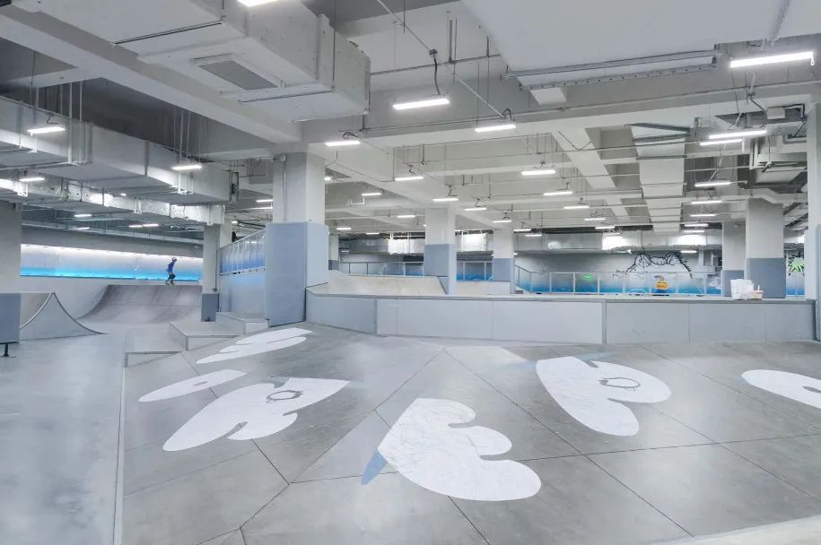 滑板公园的整体视觉采用了“昼夜黄昏线”的概念,浑然天成的清水混凝土风,搭配湖蓝色的线条,清新明快,简洁大气。场馆内还设有多处墙体涂鸦,色彩明快、画面生动,把滑板所代表的街头文化发挥更胜。