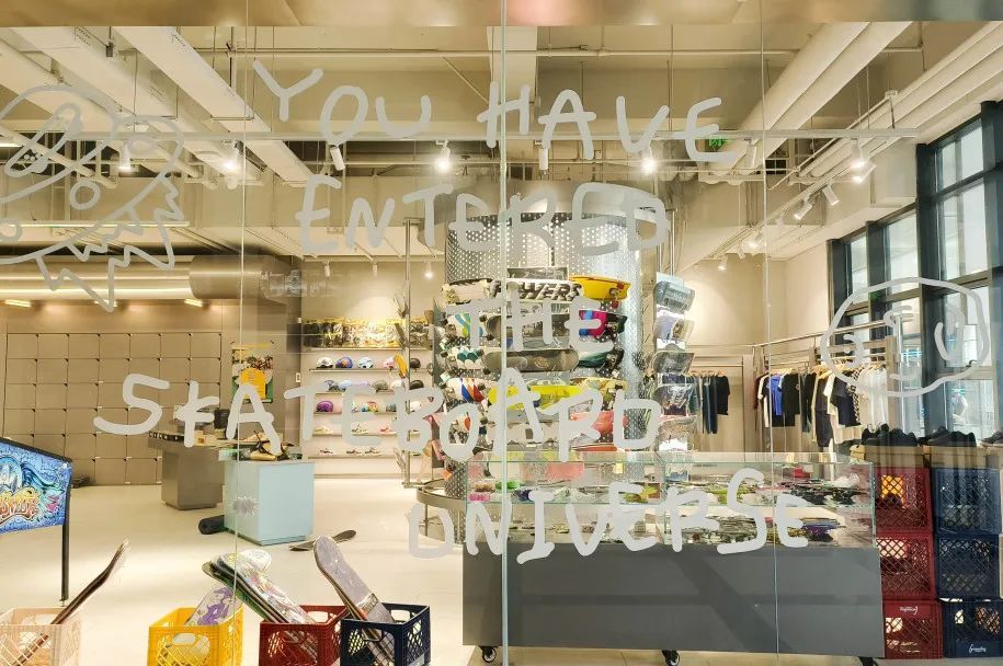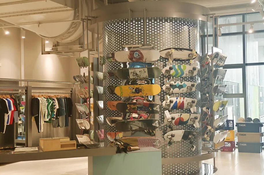 除了专业的滑道场地,滑板公园还有着互动咖啡厅一般的社交休息区。这里装修潮流、座位充足,同时陈列着各色专业滑板、滑板配件、护具、服饰以及马克杯等文创产品。大家可尽情在此休息、社交,在运动之余,结交志同道合的滑板好友。
