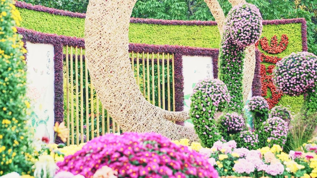 西门、南门入口互相贯通的主干道上,一步一景,以盆景菊、树菊和球菊等造型菊为骨架的菊花花境,营造出浓厚的花展氛围。