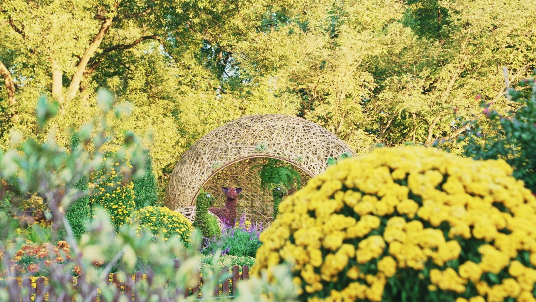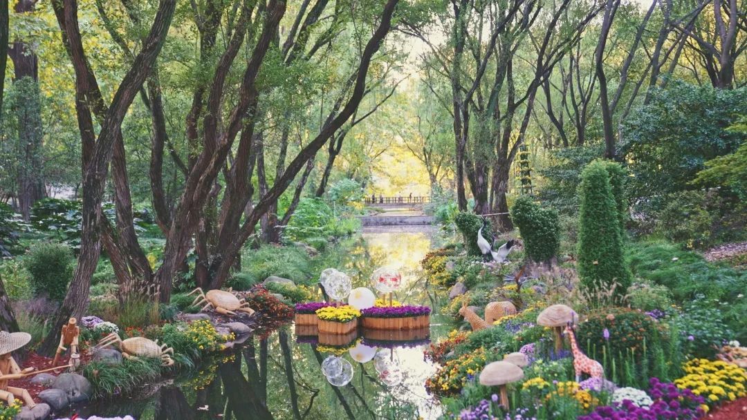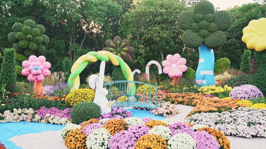 花艺馆依托森林背景,结合菊花展主题布置了8组室外景点,以菊花为主要造型材料,采用绿雕、花境等形式,打造出丰富多样的菊花景观。