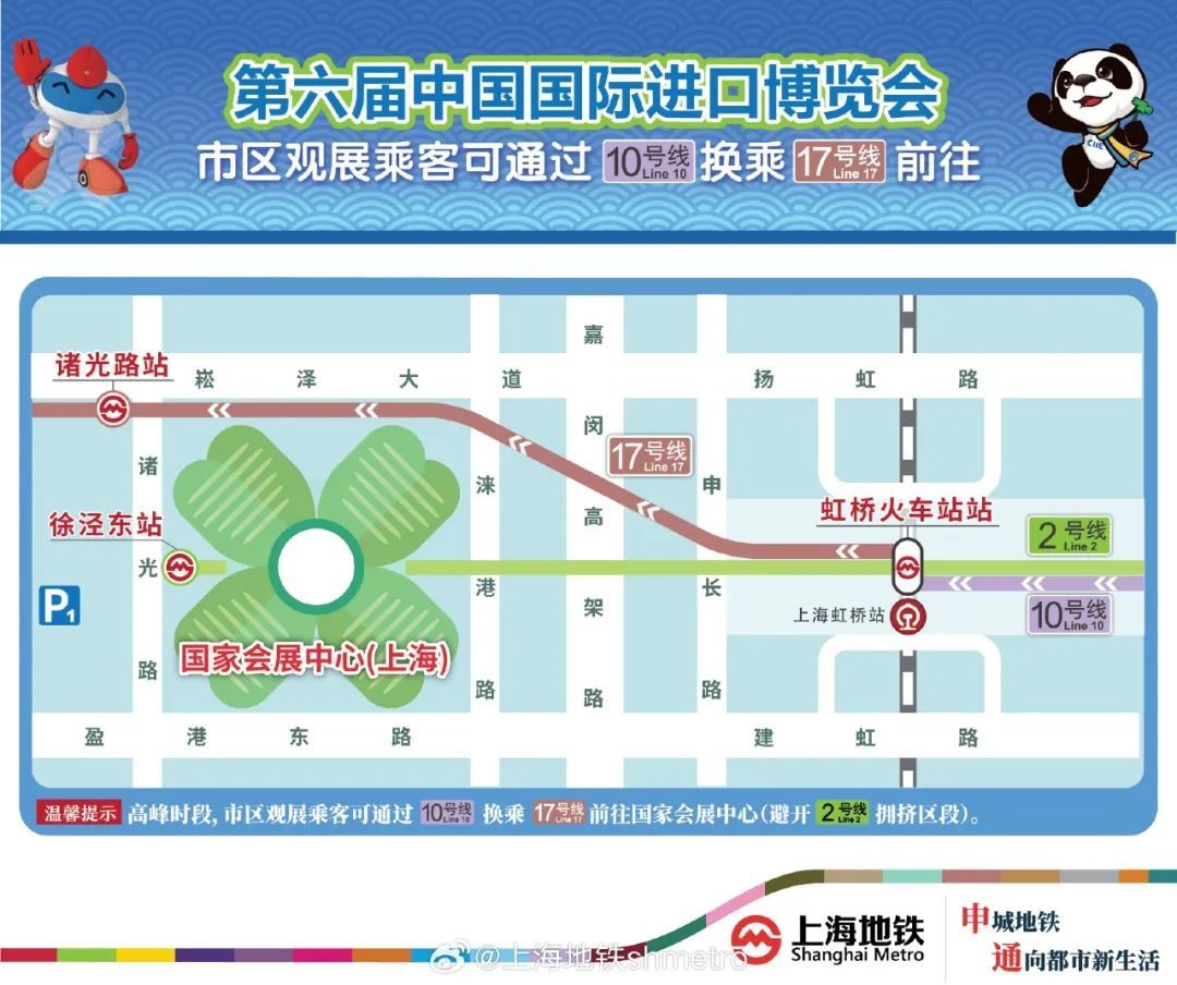 第六届中国国际进口博览会期间,由于2号线客流压力较大,建议观展乘客乘坐10号线至虹桥火车站站,再换乘17号线至诸光路站前往国家会展中心,从而避开2号线大客流区段。散场时,建议观展乘客在17号线诸光路站进站,乘坐1站至虹桥火车站站后,再换乘10号线前往市中心及换乘其他线路。