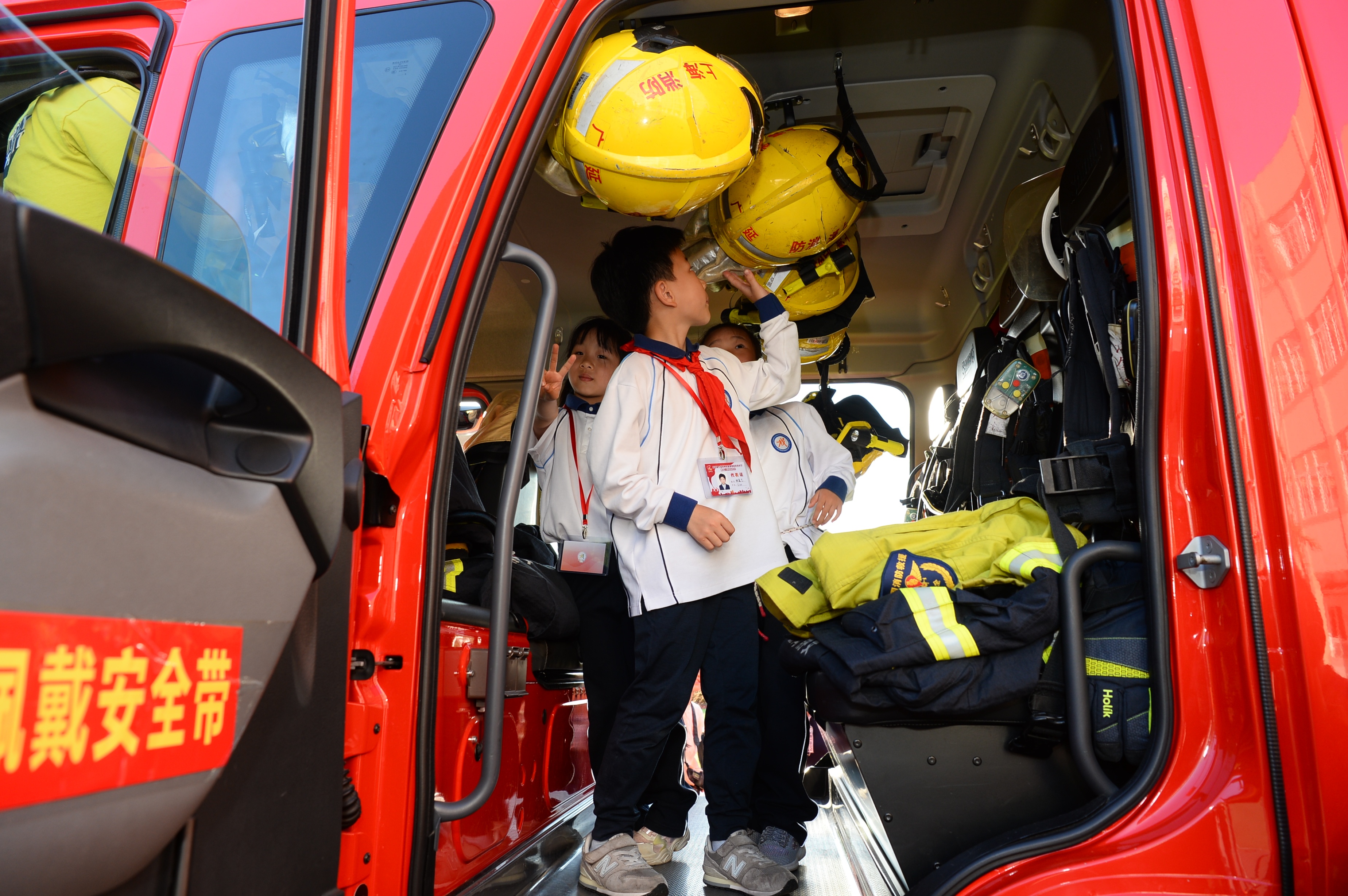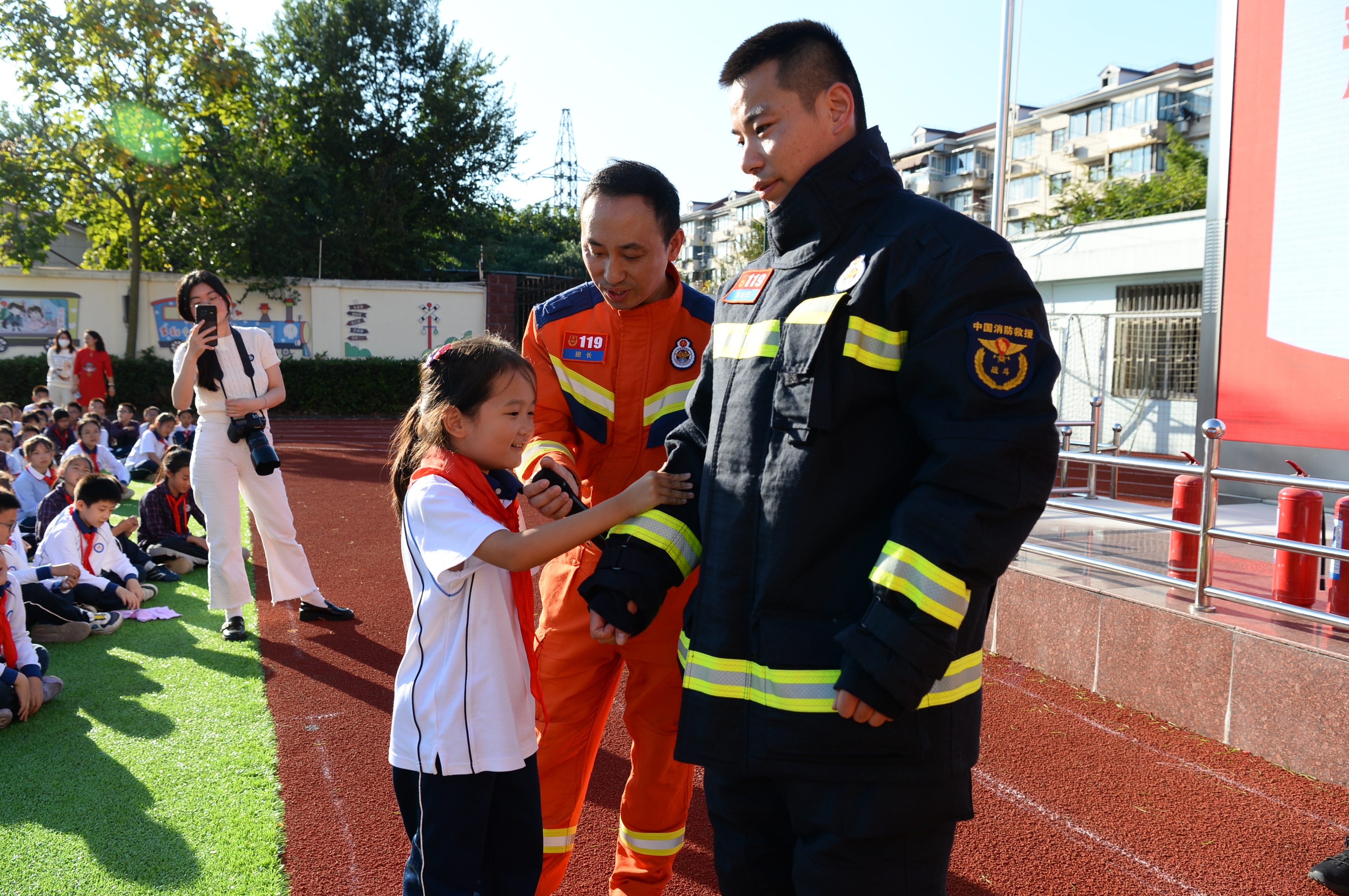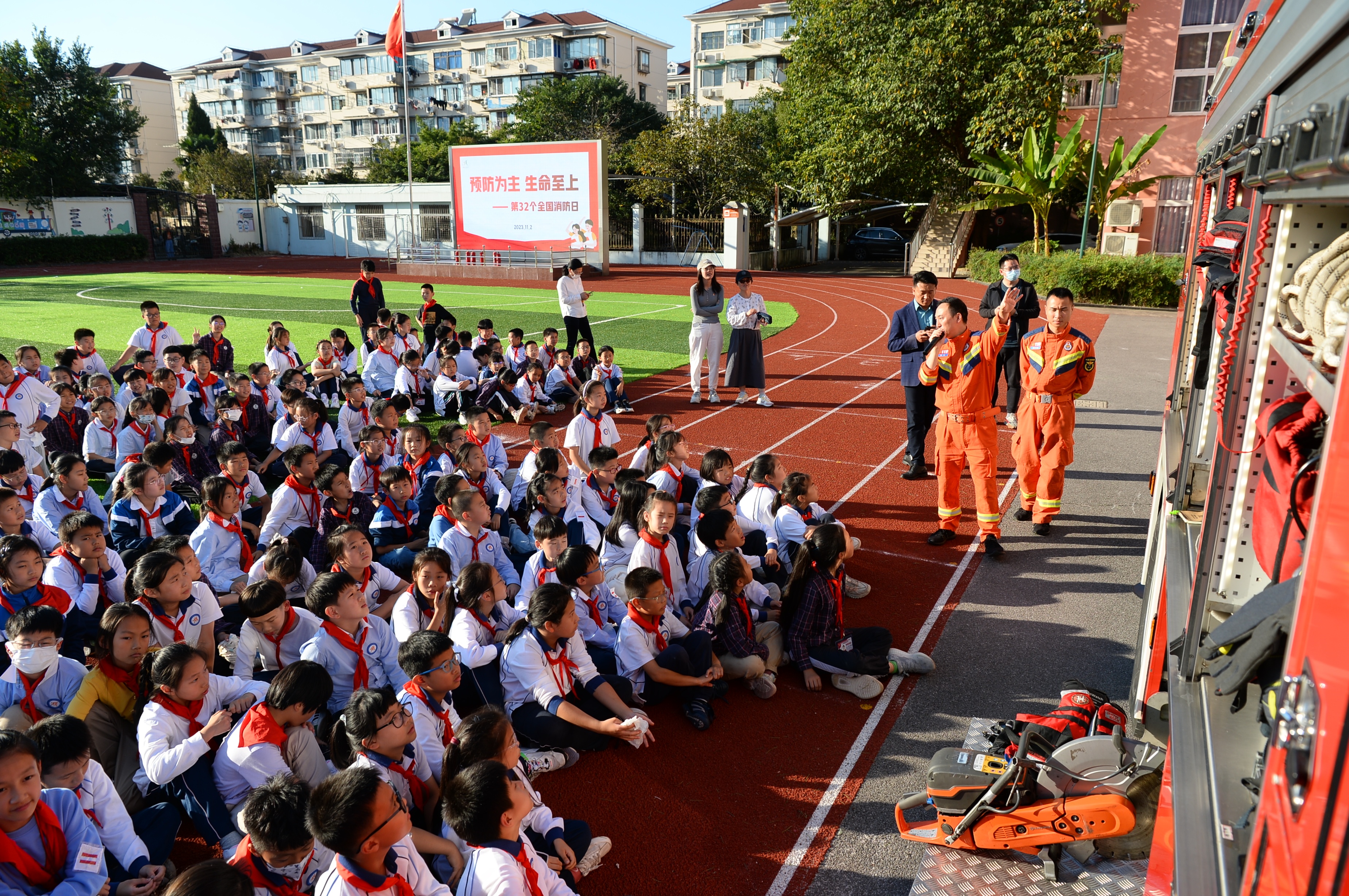来到操场之后,停在操场边上的红色消防车,吸引了同学们的注意。消防员为大家展示了消防车上的设备,讲解了使用功能,进行了消防安全知识教育。