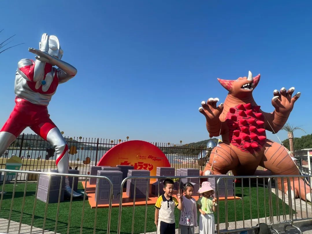 走进月湖·季高兔窝窝PANCOAT乐园,入口处摆放着一座硕大的经典奥特曼实体模型。闪光的双眼、银红相间的配色、胸前的计时器,勾起了许多人的儿时回忆。不止如此,经典奥特曼一侧还站着一只仿真怪兽梅特龙星人的充气模型,摆出了作战姿势,在一个个小房子组成的工业区内展开“巅峰对决”。记者看到,这些模型引来不少家长和孩子驻足拍照打卡,近距离感受经典奥特曼的战斗风采。
