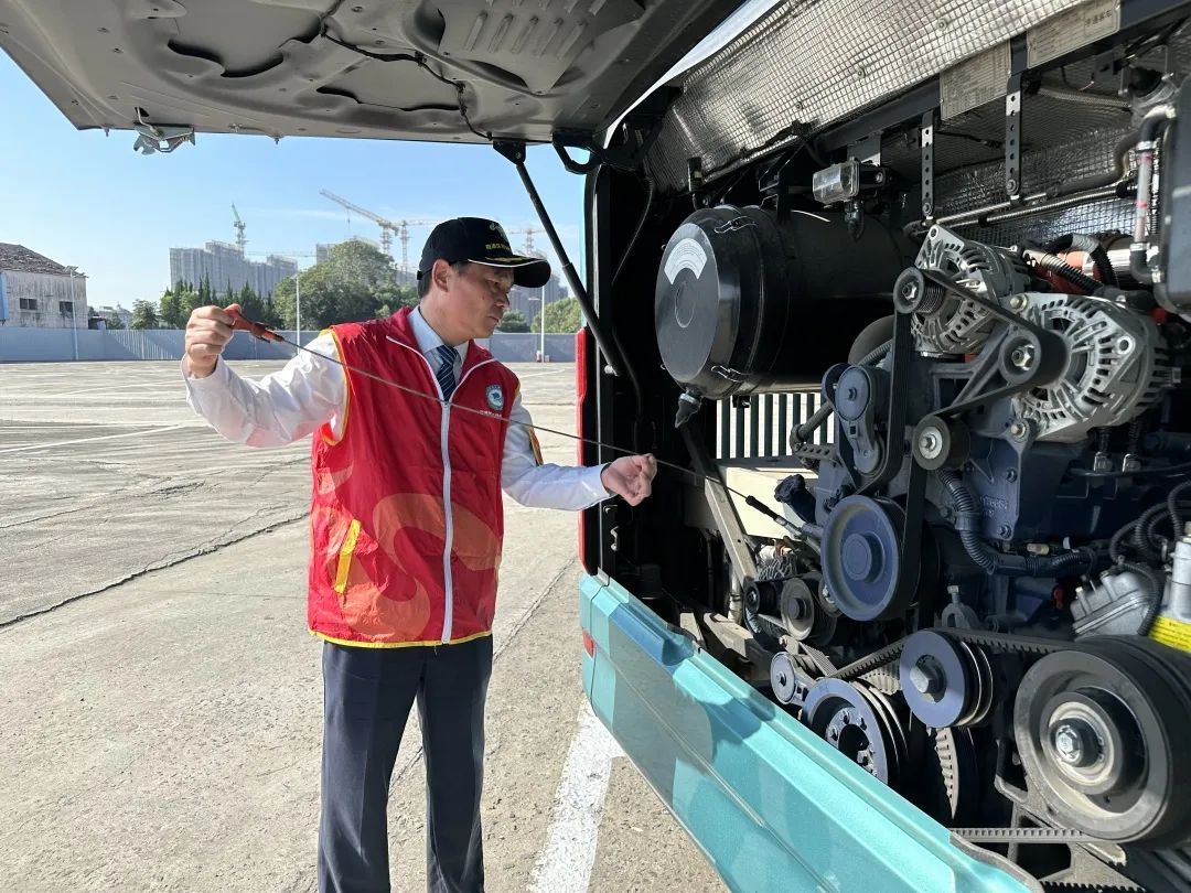 记者在进博会P16停车场看到,一辆辆忠斌旅游(集团)进博班车停放得整整齐齐,司机们都身穿制服,动作整齐划一,对进博班车进行全面细致的安全技术检查。整个车检过程严格按照规程进行,包括对车辆的发动机、灭火器、安全带、应急锤等安全设施设备的检查。