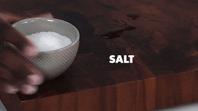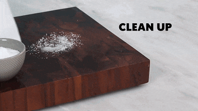 将食盐撒在菜板表面,用切好的柠檬均匀擦拭菜板,菜板就会洁净如新。
