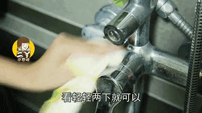 在喷壶内加入一些盐和适量的洗洁精,倒入清水稀释一下拧上盖子,摇晃均匀,再将调制好的溶液喷洒在水龙头上,用抹布来回擦拭。