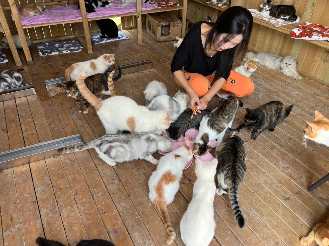 饲养员肖琳原本和鑫姐一样,是一位送流浪猫来猫岛的志愿者,把猫送到了,她被这里的环境和理念所吸引,舍不得离开了。“看了这边的环境就感觉这边特别好,很治愈,是我梦寐以求的工作。然后我就问这边的负责人,这边还需要人手吗?然后他就说,这边缺人。”