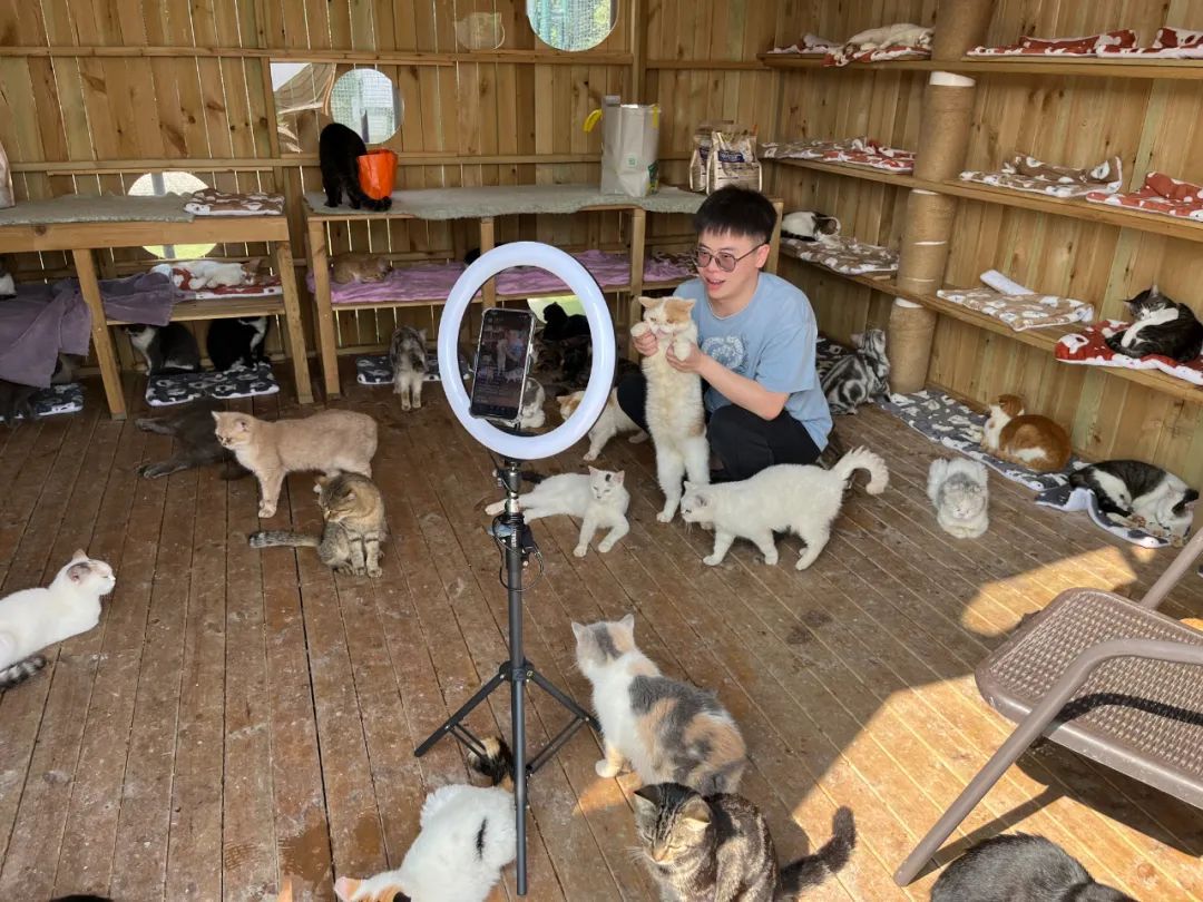 “这只小猫是上个星期刚送过来的,有喜欢的可以在我们直播间留言哦!”在成猫散养区,工作人员正在猫舍内进行日常直播,为流浪猫找寻领养人。