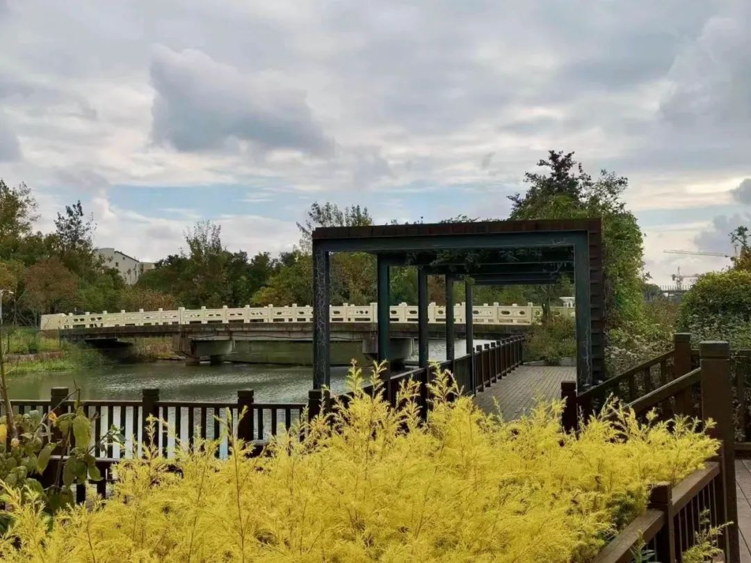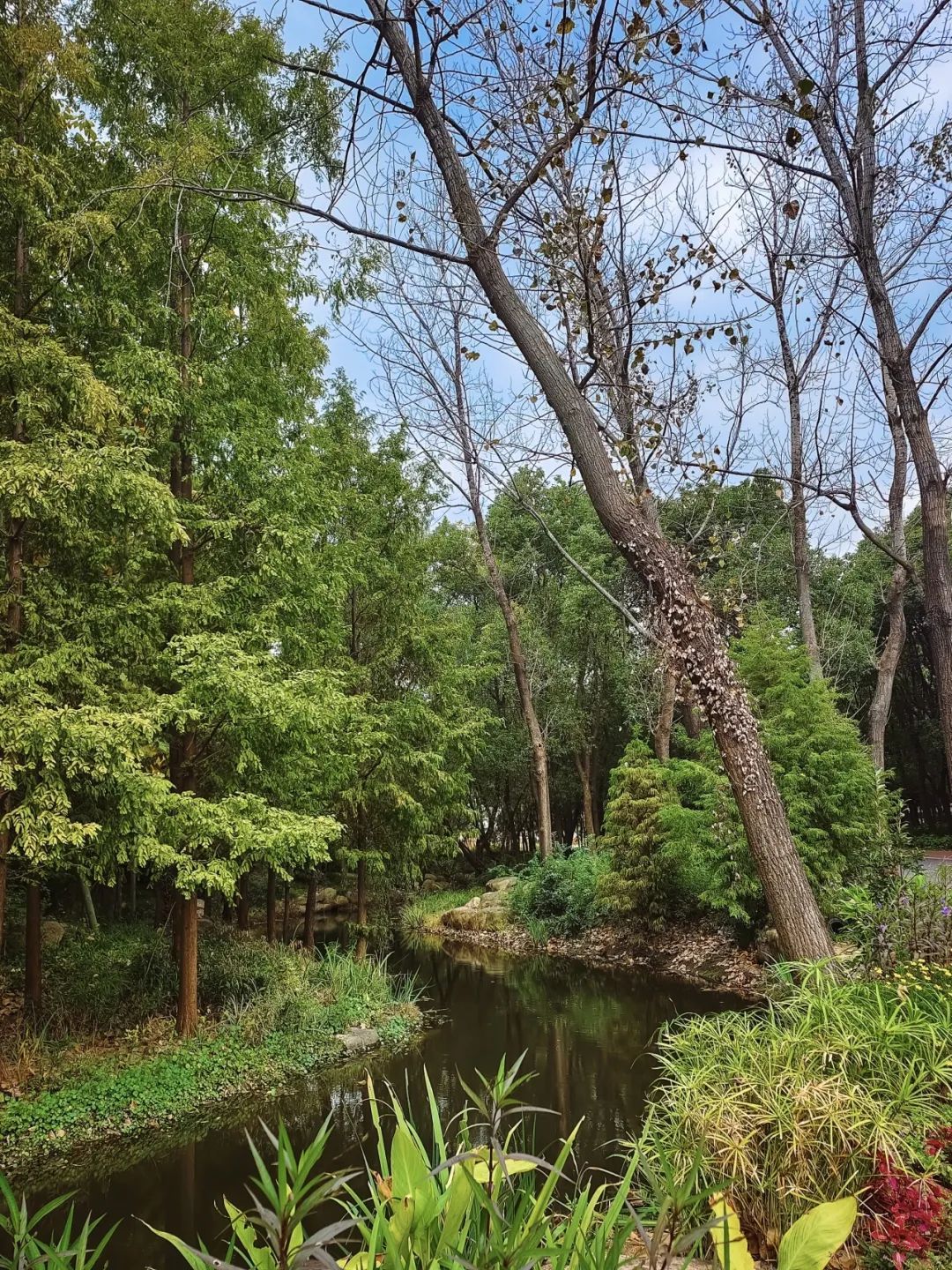 外环林带生态绿道紧邻外环西河,北起苏州河,南至沪青平西侧机场苗圃,总面积约55公顷,总长度6.25公里。眼下正值秋季,绿意之间泛起了金黄和橙红,林带中的小河中也时不时可以看到缤纷落叶,移步易景,如同油画一般。