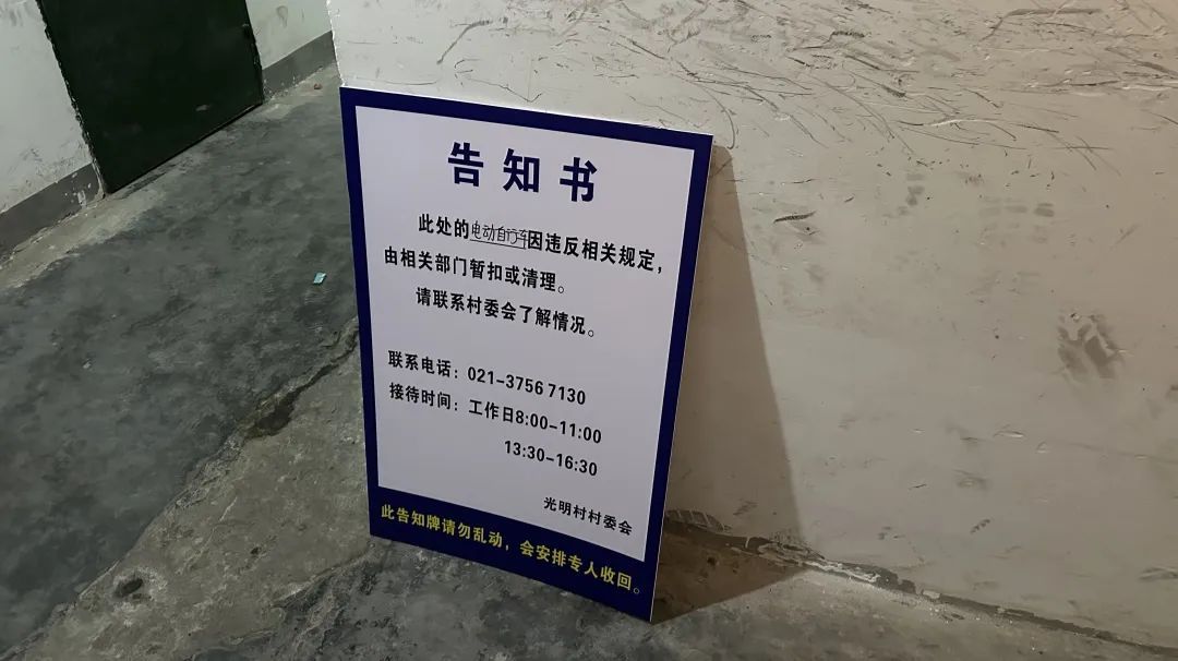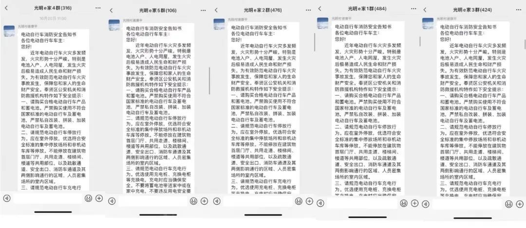 而在此之前,光明村工作人员已多次在小区显眼处张贴提醒告示,并且在“光明e家”居民微信群内发布了通知提醒居民正确规范停放电动自行车。