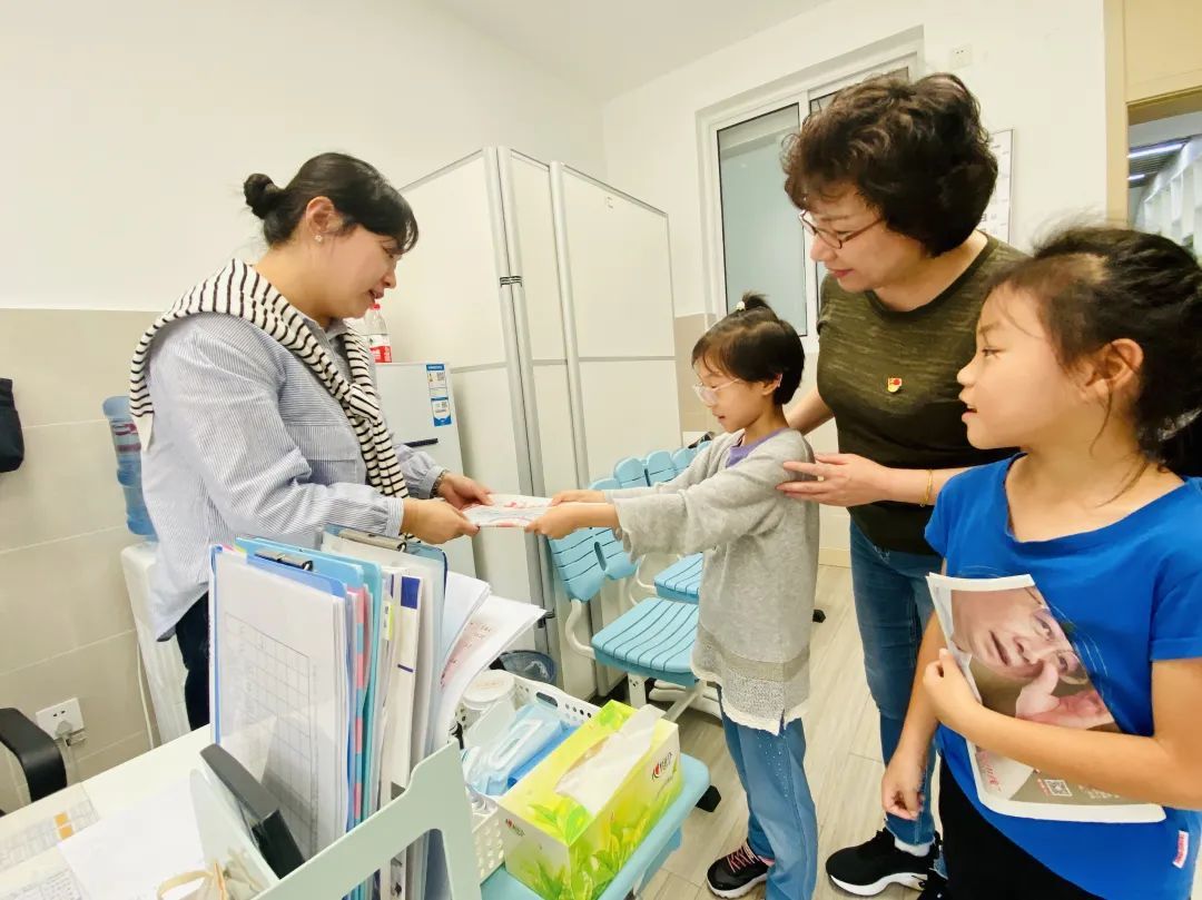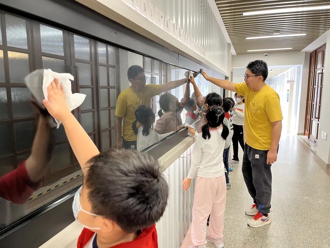 在向阳小学的校园里,经常可以看到学生们在党员导师的带领下慰问保洁、保安、绿化、食堂等工勤人员以及图书馆、文印室等工作的后勤职工,并在他们的指导下与导师一起开展劳动岗位实践体验。在门卫室,他们体验查看监控画面,了解使用安保器具的知识;在走廊中,他们学习如何清洁玻璃,如何擦拭瓷砖;在图书馆,他们学习如何将报纸杂志分配并派送到各个办公室;在食堂后厨,他们体验大灶台、大锅铲的使用,了解厨房安全常识……学校的每个角落都成为了师生们劳动实践体验的课堂。