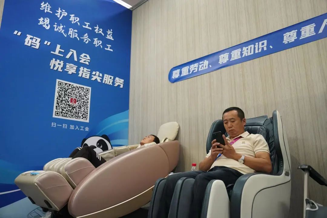 职工驿站显眼处,两张崭新的按摩椅放置其中。30平米的房间内,另配有牛奶、饮水机、医疗箱、充电宝、电脑、打印机等设施,提供着一站式、多元化的暖心服务。