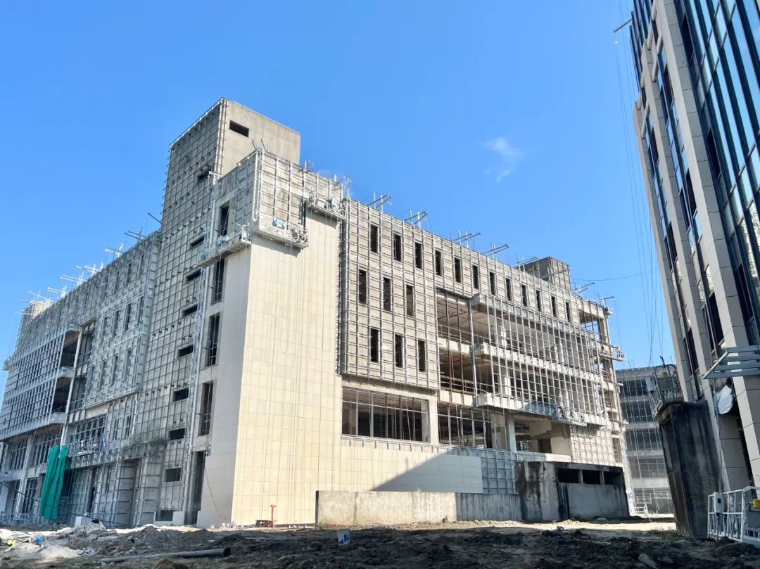 施工现场,一栋栋主体建筑雏形已显,立面龙骨已完成搭建,工人们正进行多线施工,全力抓抢工程进度。