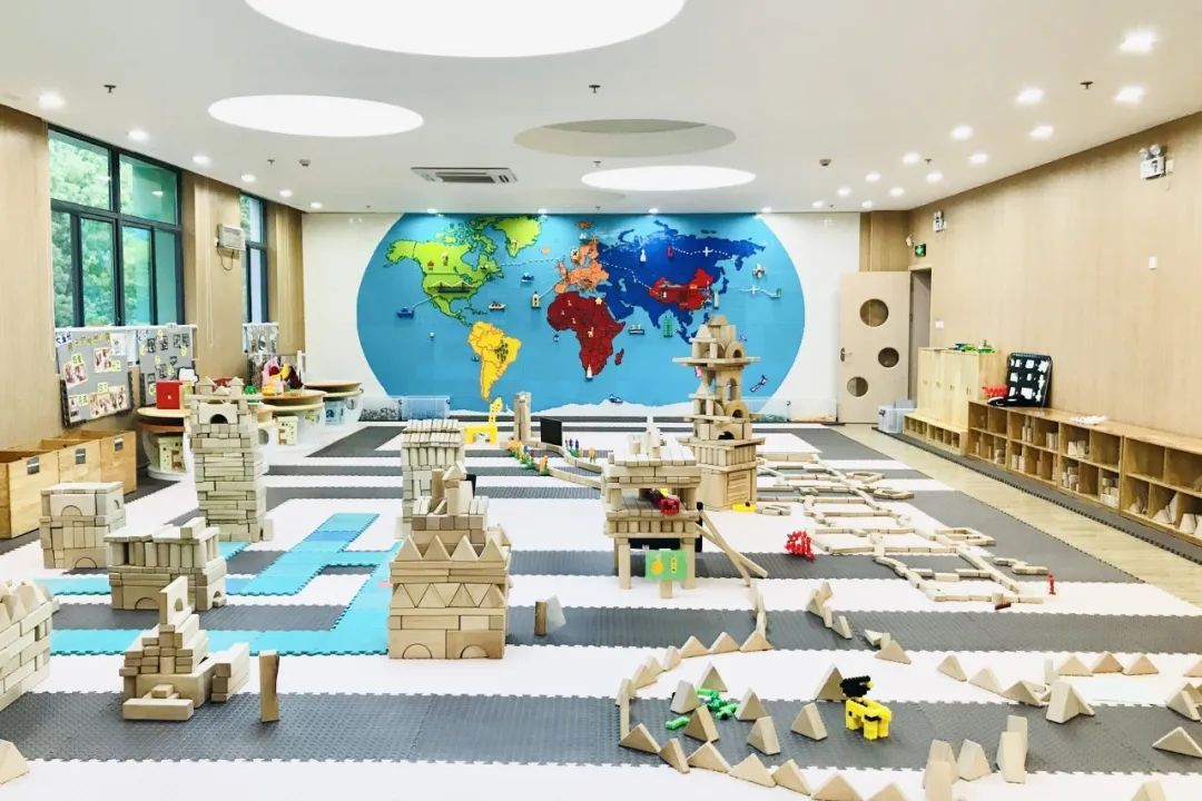 在海贝幼儿园,积木、积塑、沙石土等结构游戏的元素随处可见。从教学楼一楼的幼儿结构作品展览,到二楼充满热带雨林风情的美术室、三楼堆满定制积木的大结构室,再到教室的拼接班牌、积塑大船和微型生态小花园,各类结构材料布满校园,为孩子们提供了一个充满趣味创造的环境。