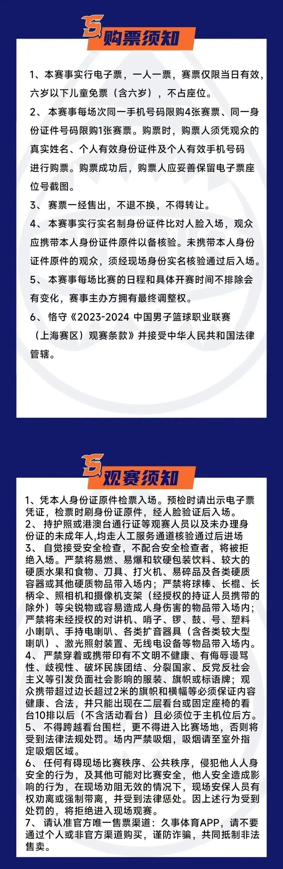 注:上海久事大鲨鱼新赛季主场门票实行实名制认证,需收集、核验进场观众个人信息。确认中奖以工作人员通知为准,未中奖者将不再单独通知或公示。以上注意事项仅供参考,最终解释权归办赛方所有。