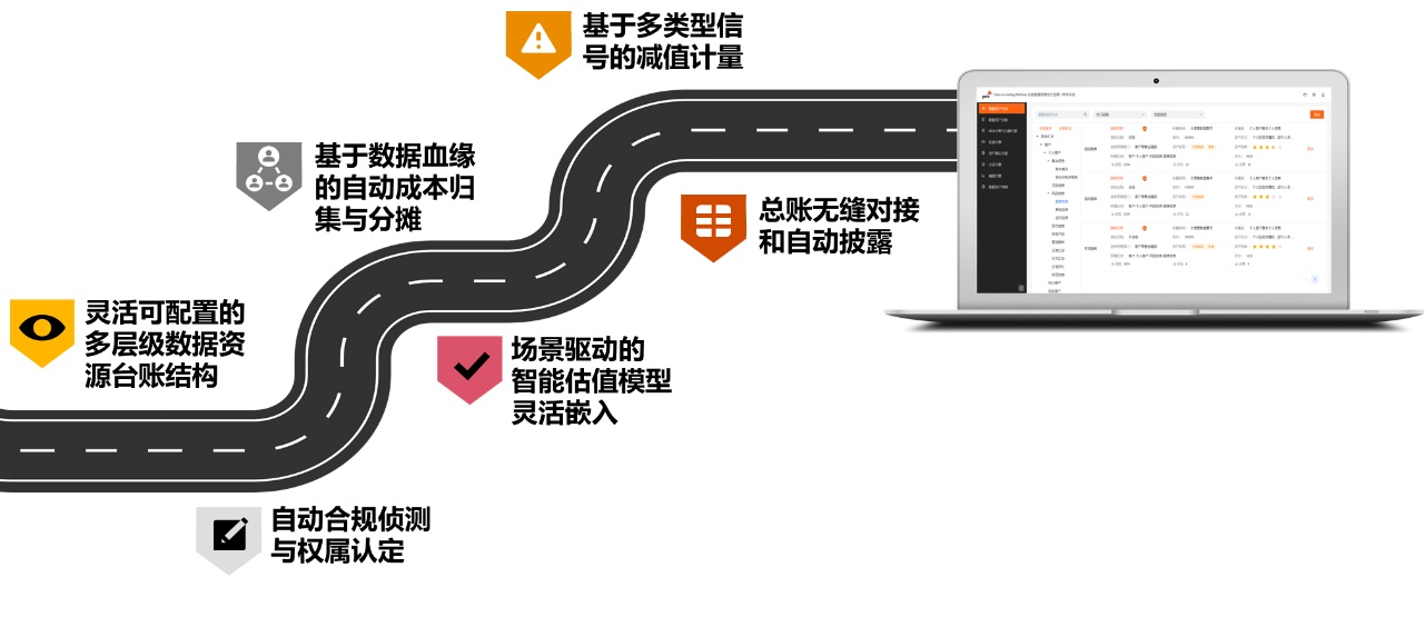 DAP的六大核心功能包括:灵活可配置的多层级数据资源台账结构、自动合规侦测与权属认定、基于数据血缘的自动成本归集与分摊、场景驱动的智能估值模型灵活嵌入、基于多类型信号的减值计量、总账无缝对接和自动披露等。