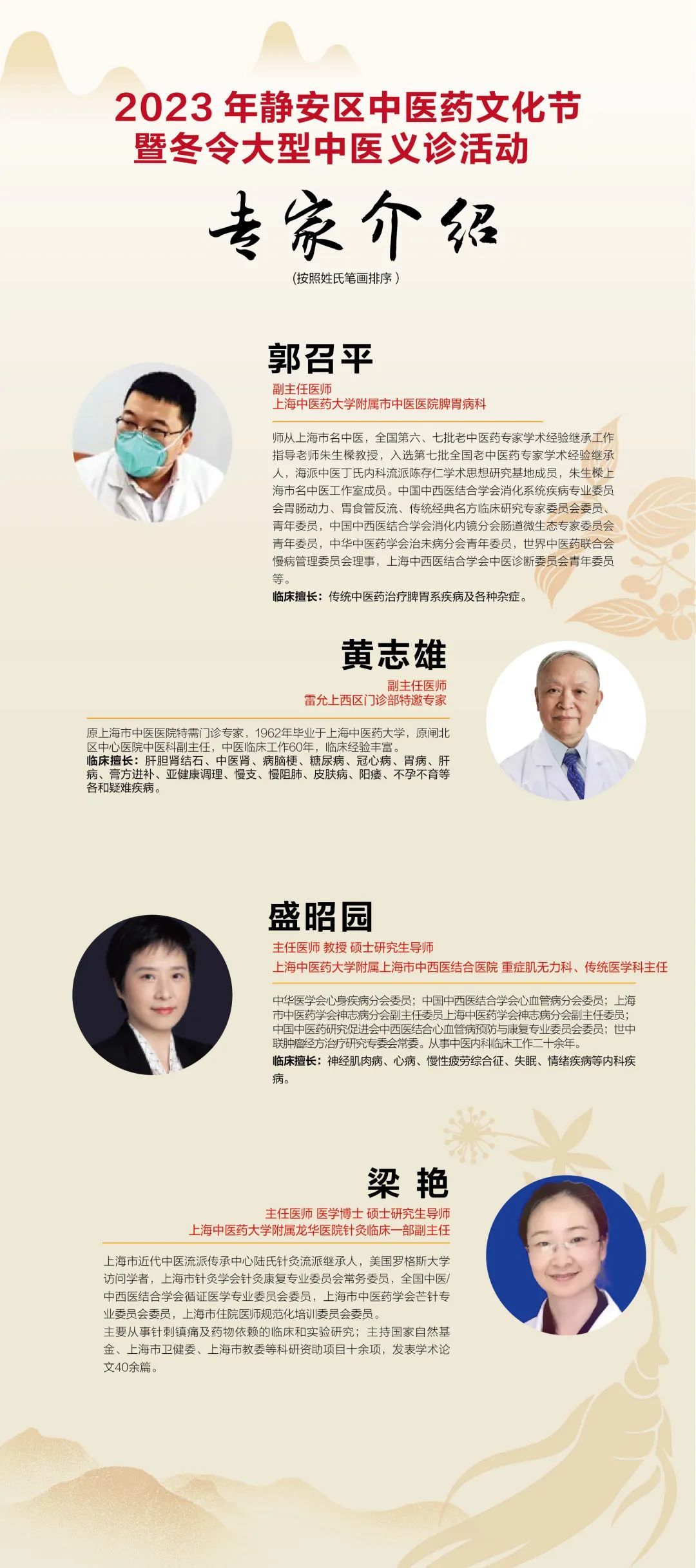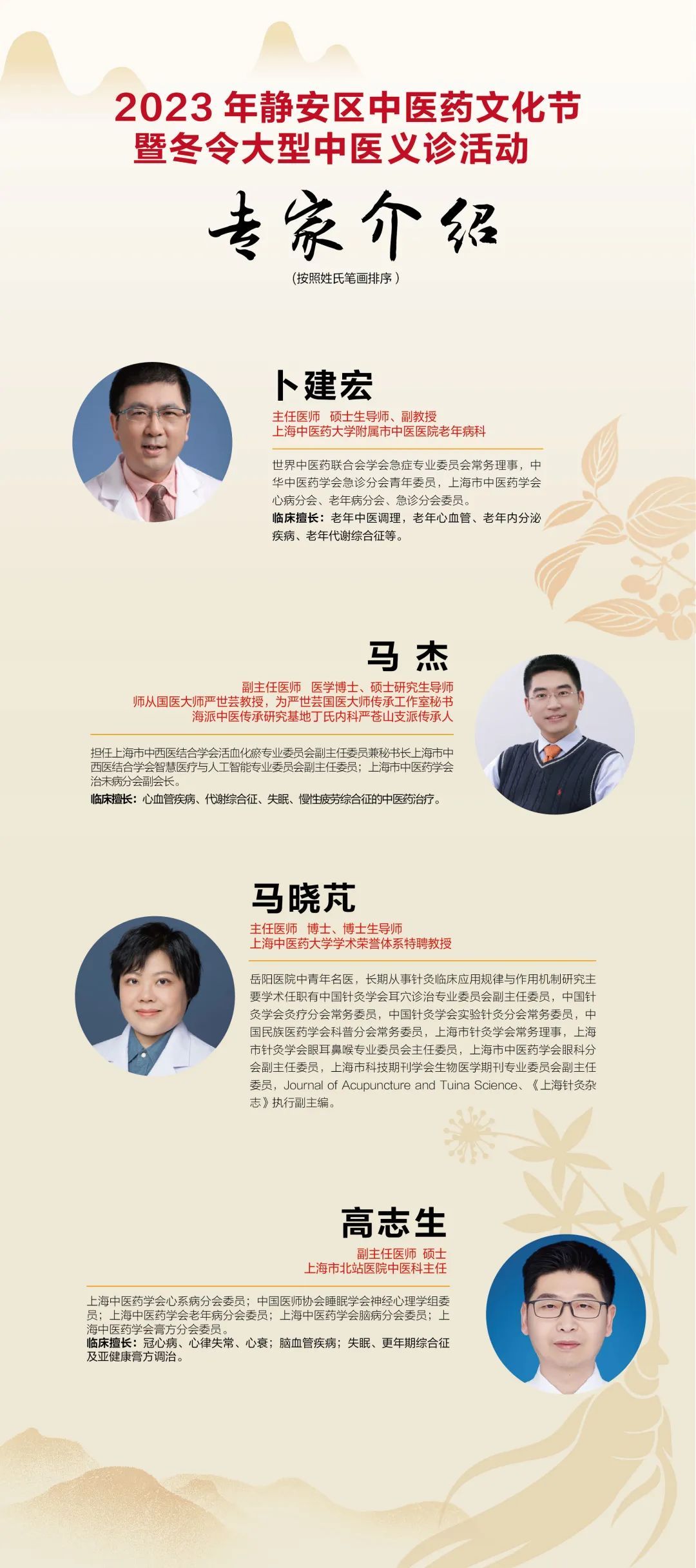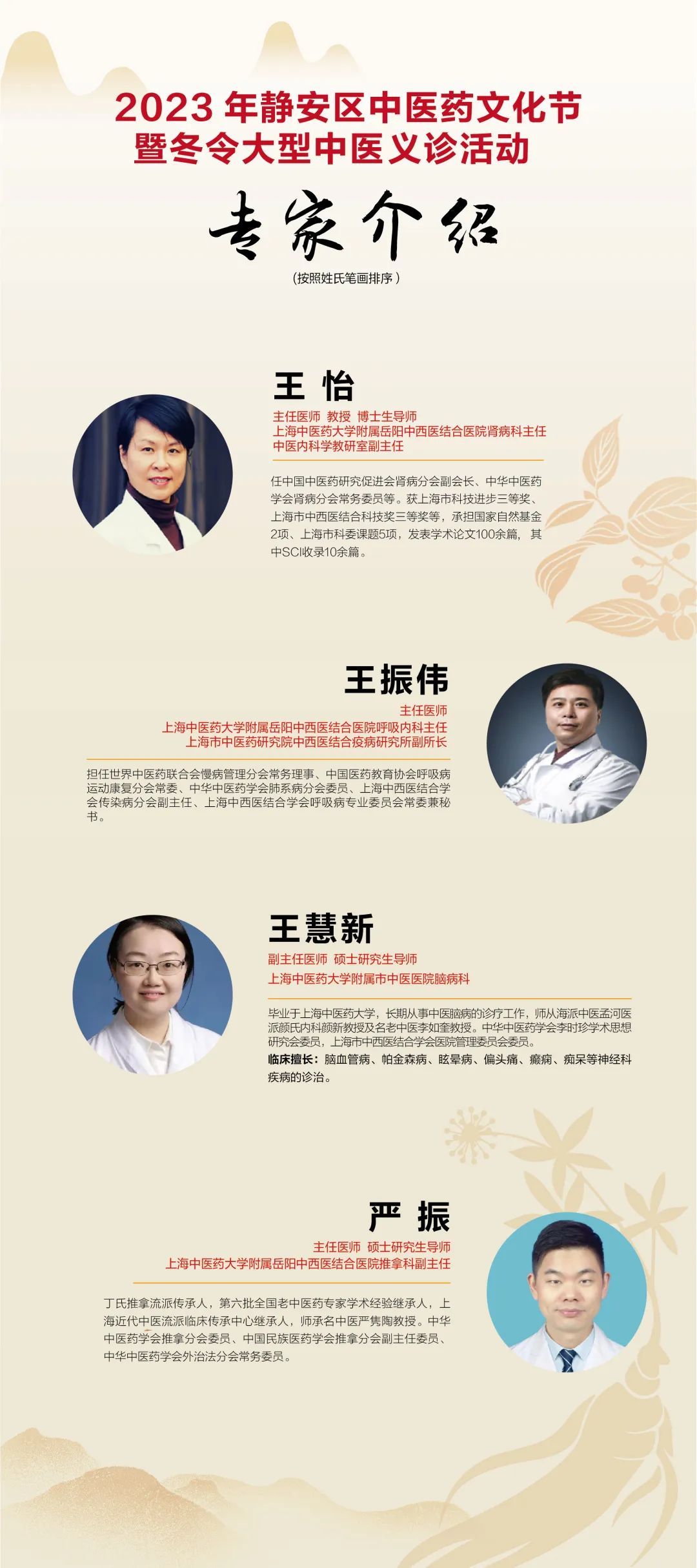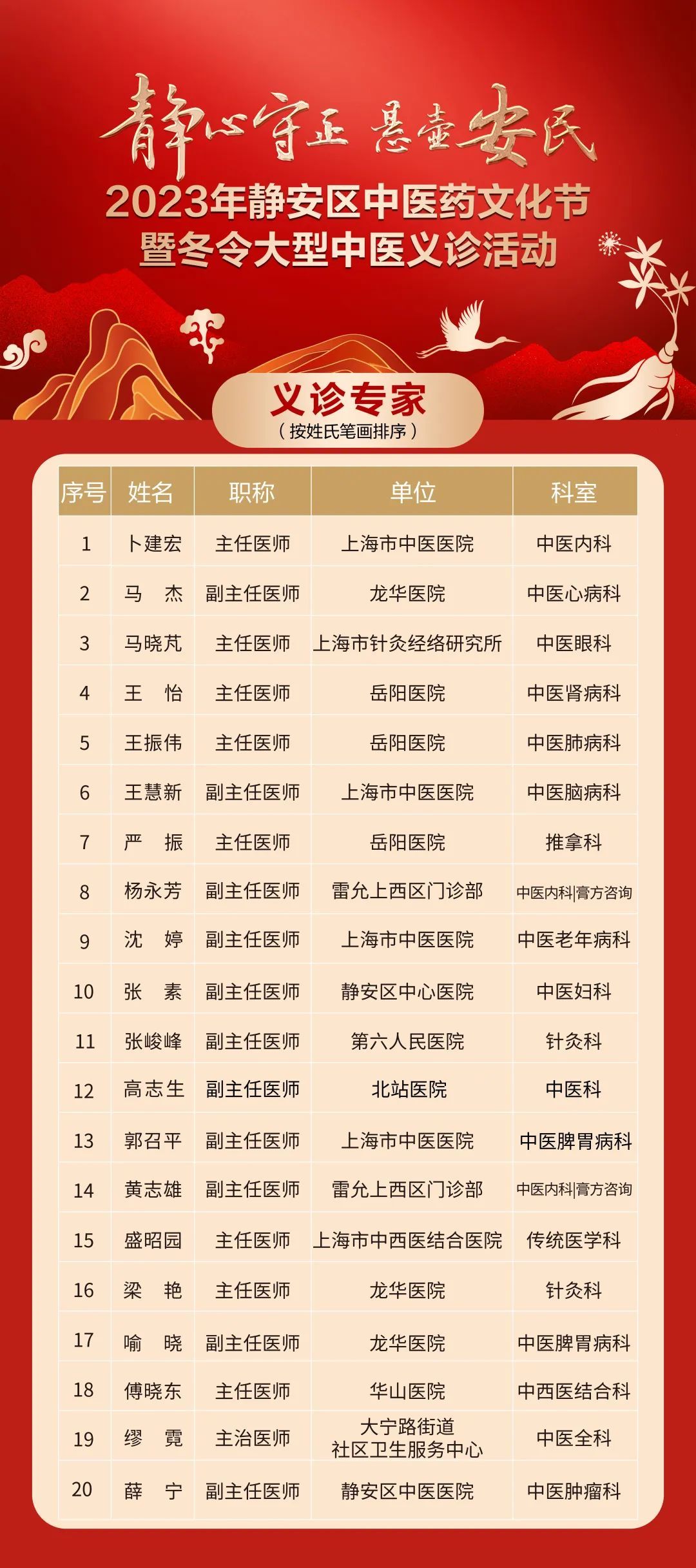 来自华山医院、岳阳医院、龙华医院、上海市中医医院、上海市针灸经络研究所、静安区中心医院、静安区中医医院等12家医疗及研究机构的20位名医专家将亲临义诊活动现场,为居民提供专业的问诊咨询服务及冬令健康养生建议。