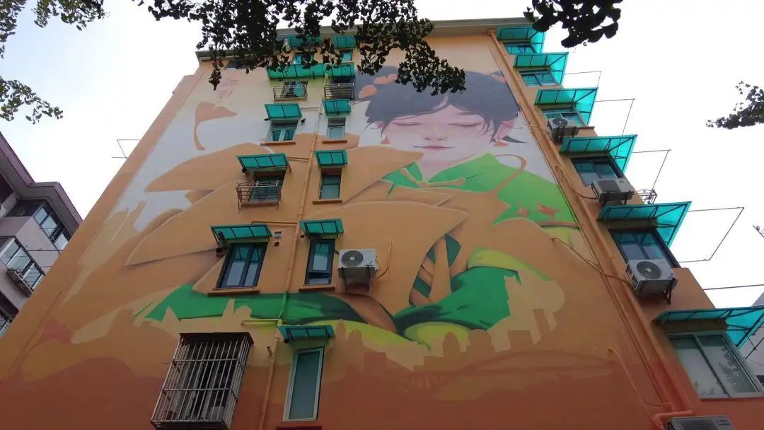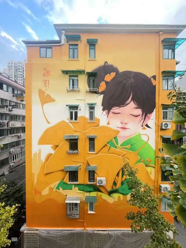 原来,这幅巨型涂鸦在绘制设计上,早就想好了跟整条局门路银杏大道相互吻合。这样颜色的基调,基本以金黄色为主,再加上这条路上有两所学校以及儿童服务中心,画面以一个紧闭眼睛正在追梦的少女为中心,突出“小成若杏,如日方升”的主题。除了以墙体展现内容外,这样的涂鸦还用了专用的防水涂料,解决了居民楼墙体多年没解决的难题,可谓是一举两得。