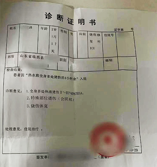 11月6日,记者通过电话联系到正在照看泽泽的泽泽姑姑,她告诉记者,根据医院给出的诊断证明书显示,泽泽全身多处热液烫伤IT-T45%TBSA、特殊部位烫伤、烧伤休克,建议住院治疗。“入院的时候医生给出了两个治疗方案,一是手术,二是保守治疗。”泽泽姑姑告诉记者,手术所需要的费用太高,家庭难以承担手术费用,而且孩子太小,身体各项体能太弱,身体贫血,烫伤程度又太高,如果进行手术容易对孩子造成二次伤害,因此,泽泽目前正在接受保守治疗,但这是漫长的过程,尽管表面上看一时的花费少,实际算下来也是一笔不少的费用。