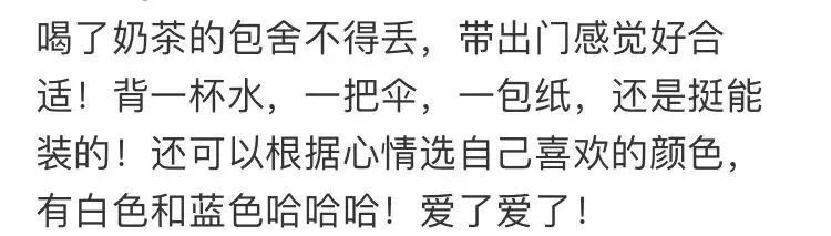 “怎么用都不心疼,奶茶袋甚至治好了本届年轻人的包包焦虑。”