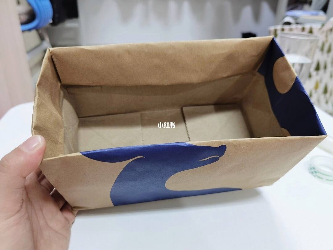 网友分享:用剪刀沿着奶茶袋中间或中上的部位剪开,把有提手的部分剪掉,再向外翻折一下,就可以成功做出一个收纳盒。