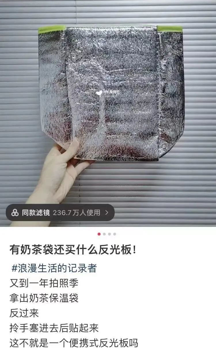 网友提醒,如遇光线不佳,只需将奶茶袋的里面朝外翻,就是一个妥妥的反光板,既轻便又实惠!