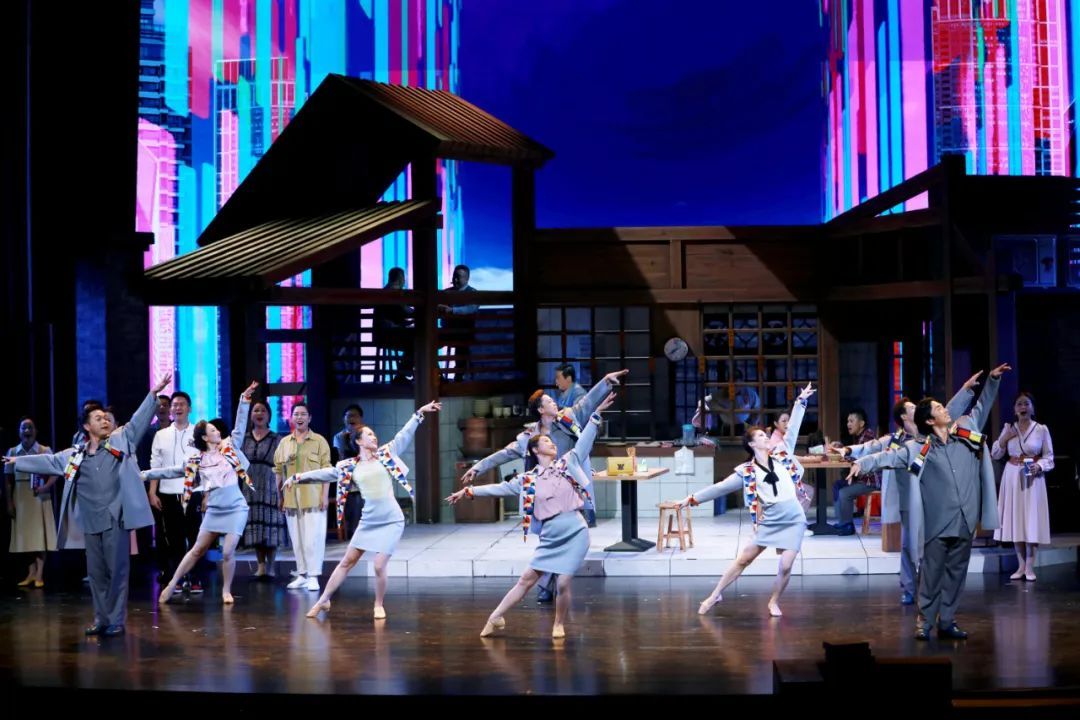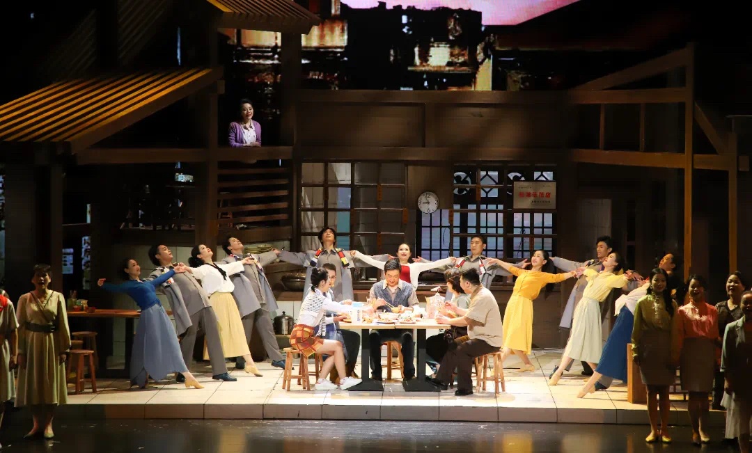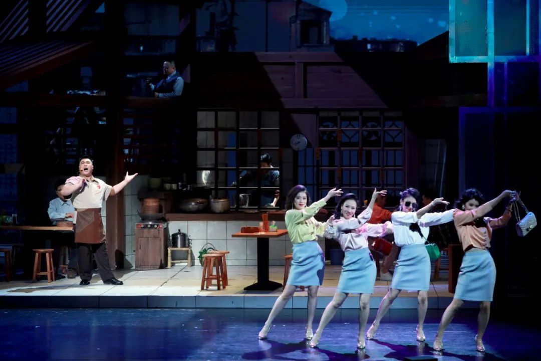 音乐剧充分发挥歌舞等表现手段,以形式多样的音乐唱段,叙述小店的烟火日常和小吃品类,抒发剧中人情感心绪的变化。与音乐相伴的舞蹈,在呈现场景、烘托情感的同时,也营造出欢乐的舞台气氛。配合《沙县style》等唱段的群舞,以五光十色的餐具、蔬菜为道具,活泼、欢快的歌舞场面让舞台上浓郁的烟火气息扑面而来。舞台设计通过场景装置与多媒体影像的结合,将大上海熟悉的街景和缤纷多元的面貌呈现于舞台。当说唱沙县小吃一年四季的美味大全时,小店上方霓虹闪烁变换出的一串串美食招牌,令人目不暇接。