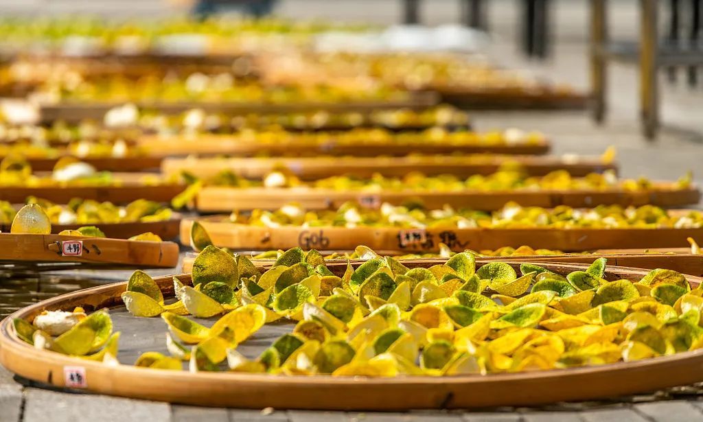 每年10月,茶枝柑成熟之后,就会开始陈皮的制作。储存年份越长、保存越完好的陈皮,等级越高价值越高。