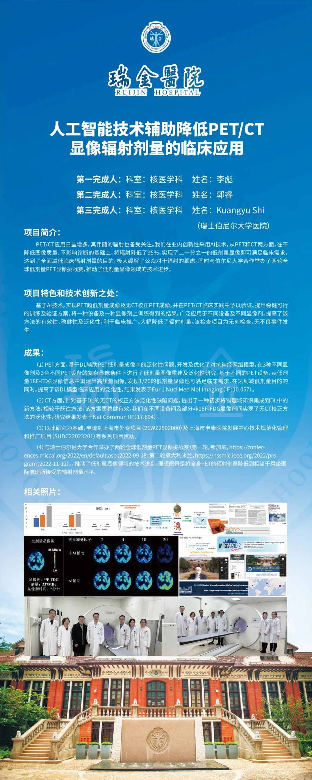 瑞金医院核医学科为国家及上海临床重点专科,是国家卫健委首批批准配置PET/MR的五家医疗机构之一,科室拥有包括全身PET/CT在内的多台国际尖端分子影像设备。瑞金医院核医学科不断推动新型放射性分子探针显像新技术在肿瘤、神经和心血管等疑难疾病诊治中的临床应用。同时逐步构建了AI辅助的核医学低剂量显像方案及精准诊疗智能评估体系,连续八年位居复旦版全国专科综合排名前十。