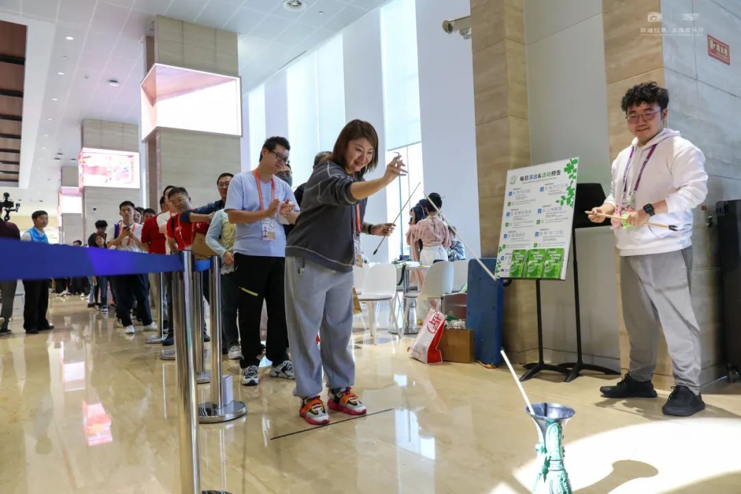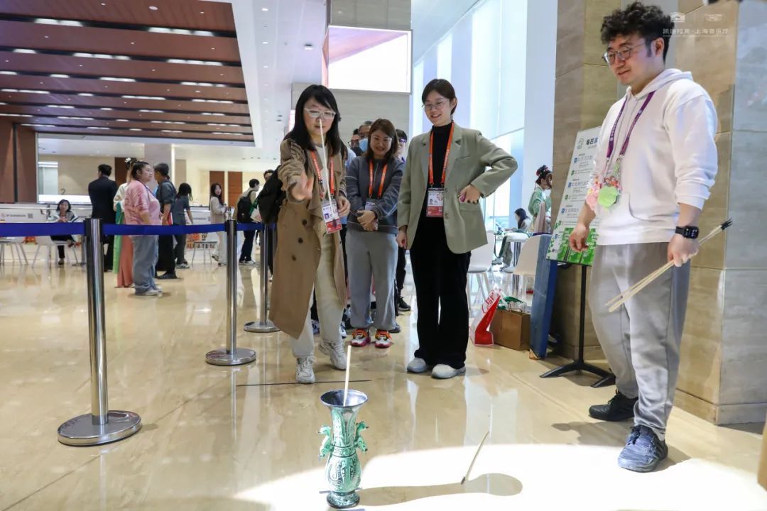 古代十分流行的投壶活动也被搬到了新闻中心,工作之余,记者朋友们玩得不亦乐乎,并收获了上海音乐厅即将上新的衍生品“缪斯殿堂拱形窗香挂”。