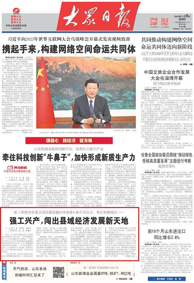 “紧盯‘强工兴产、转型突围’目标,大力实施工业倍增计划,大抓产业、主抓工业、突破园区、育强企业,以工业经济大突破带动县域经济大发展。”薛城区委书记巴海峰说。前三季度,薛城区完成地区生产总值243.18亿元、增长6.3%;1—9月,一般公共预算收入22.9亿元、增长7.4%,固定资产投资增长7.0%,规上工业增加值增长13.9%。