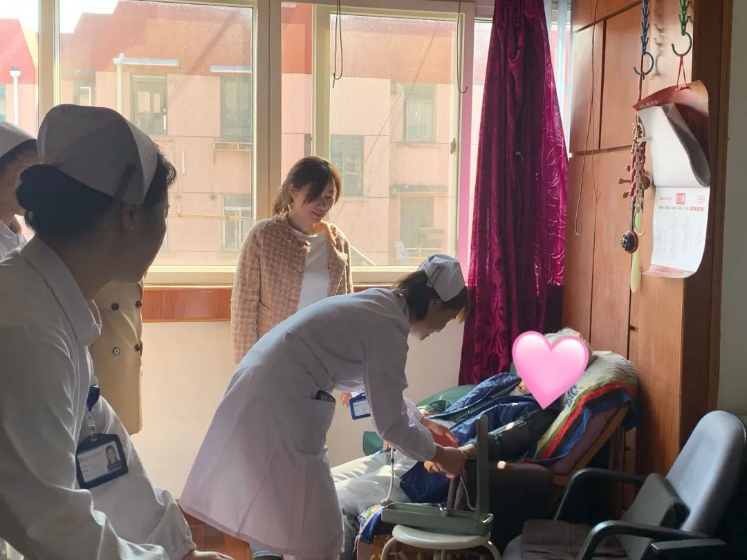 得知此情况后,护理部谢菲主任带队前往居民家中进行上门指导。在王阿姨的家中,康复专科护士给王阿姨测量了血压、心率,根据年龄、身体状况、用药情况、生活起居进行了针对性的护理评估,实际指导如何在居家环境中床上运动、轮椅转移技术等,并从饮食指导、肢体功能锻炼指导、防跌倒防压疮护理指导、并发症的预防等方面,向王阿姨及她的女儿提出了居家康复护理建议,并给予王阿姨身心安慰和暖心关怀。