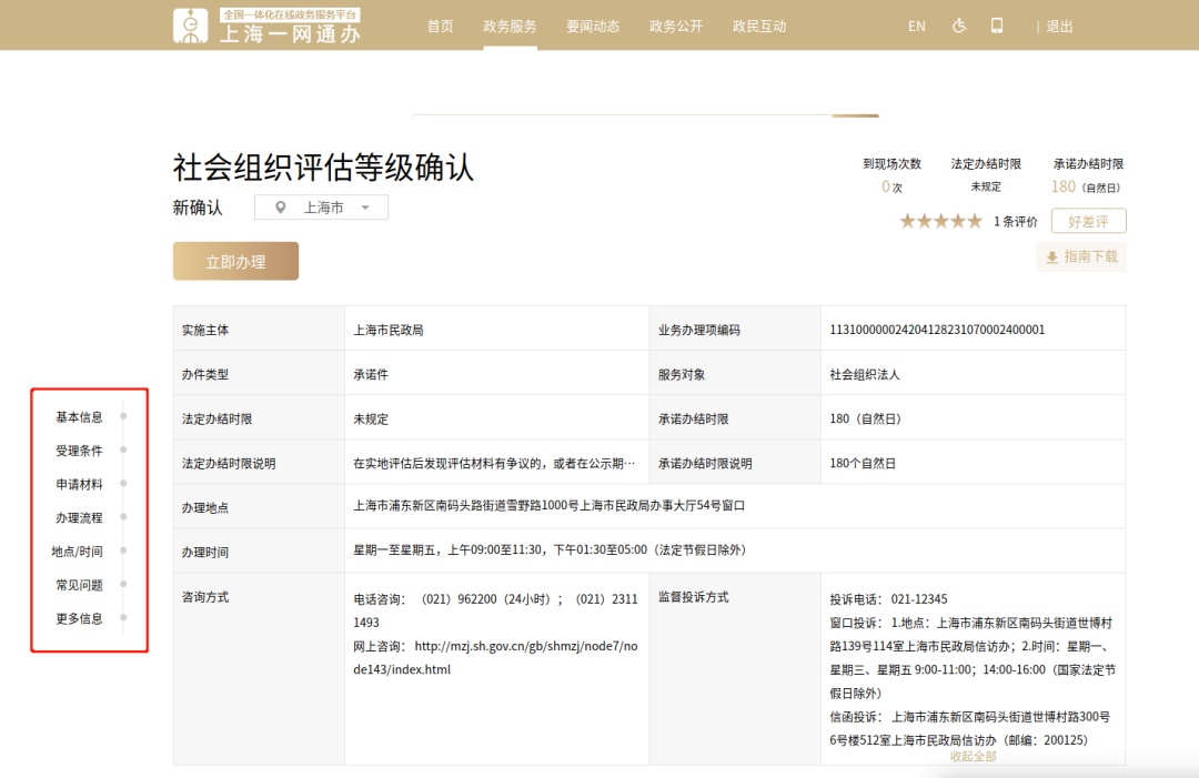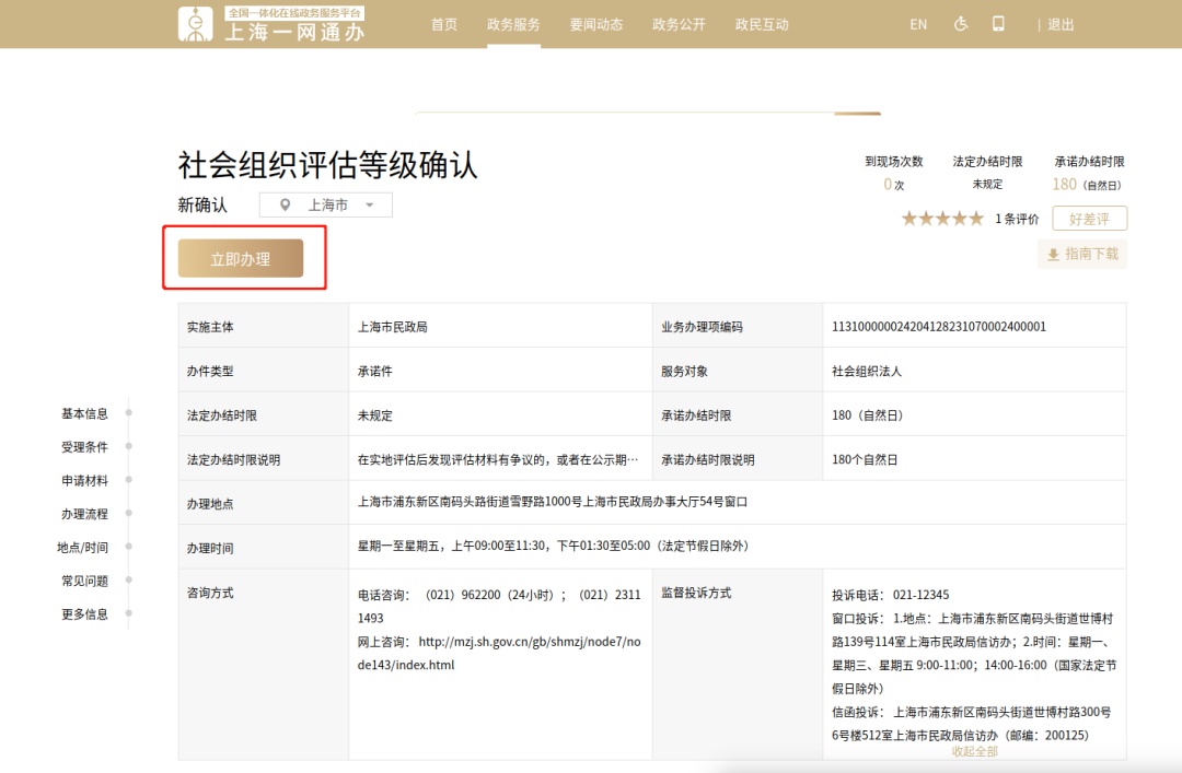 3、点击“立即办理”图标,即跳转到“一网通办”对应的政务服务事项,查看办事指南详情。