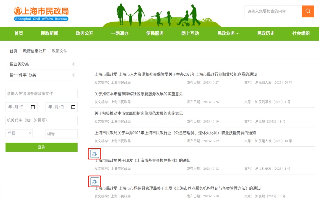1、在上海市民政局网站“政务公开->政策文件”栏目(https://mzj.sh.gov.cn/mz-zcwj/index.html)中看到带有“办”图标的文件。