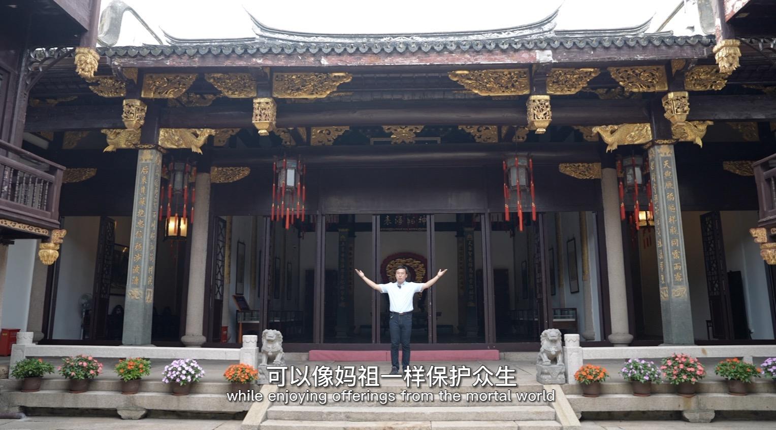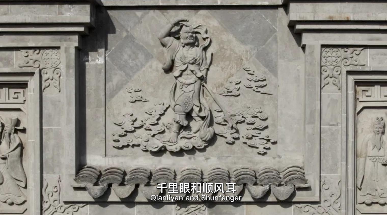 今天我们来说说天后宫石刻上的有趣故事。大家抬头看看,在门楼的最上方,天后宫石刻的左右两边,分别是妈祖娘娘的左右护法千里眼和顺风耳,这两位在民间的名气也是相当高的,一位聪而善听,一位明而善视。