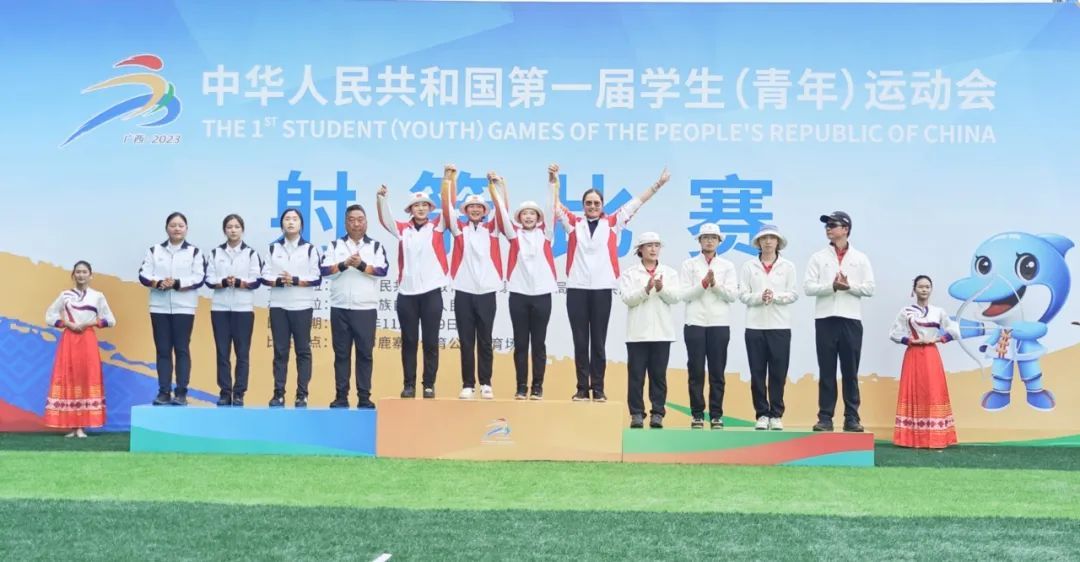 女子反曲弓团体比赛中,上海市黄浦区队(中)获得冠军