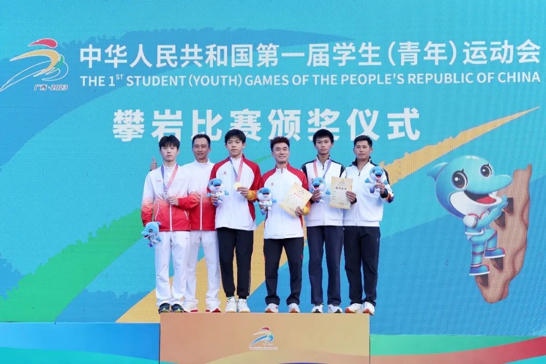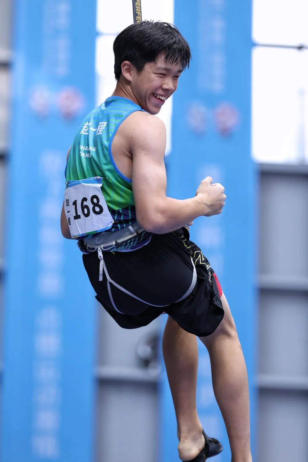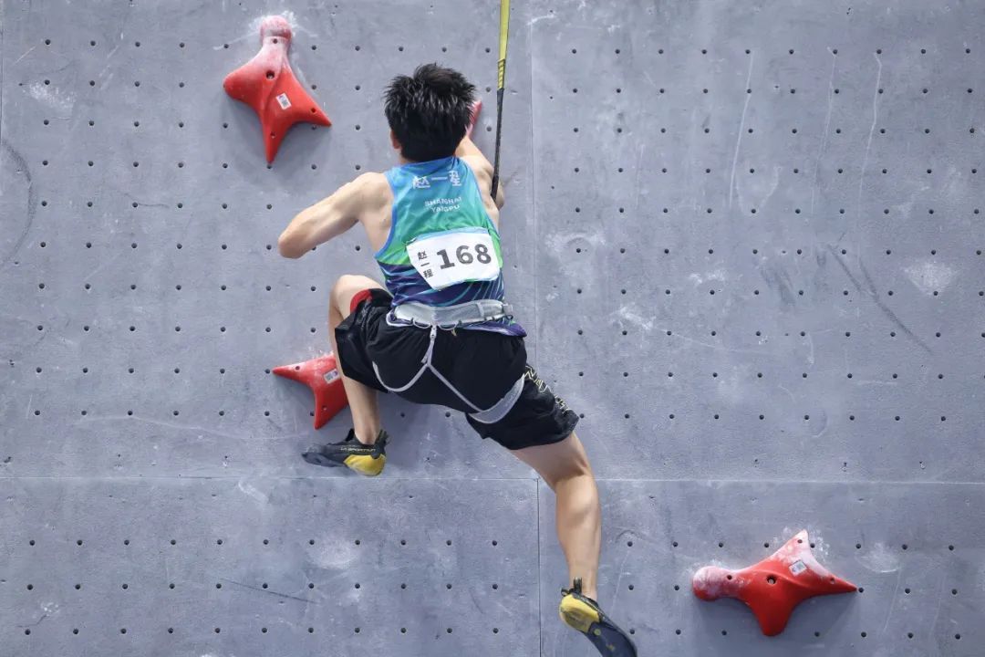 攀岩男子速度比赛中,上海市杨浦区队赵一程(左三)获得冠军